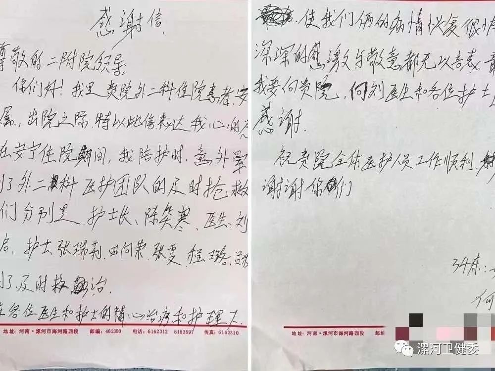 何先生的愛人因外傷入院,經(jīng)過醫(yī)生護士的治療恢復(fù)良好。3月18日何先生的愛人康復(fù)出院,何先生送來了一封感謝信。信中寫道“沒有你們的及時搶救,我這命都沒了,我們不會說啥,但心里是真心的感謝!”