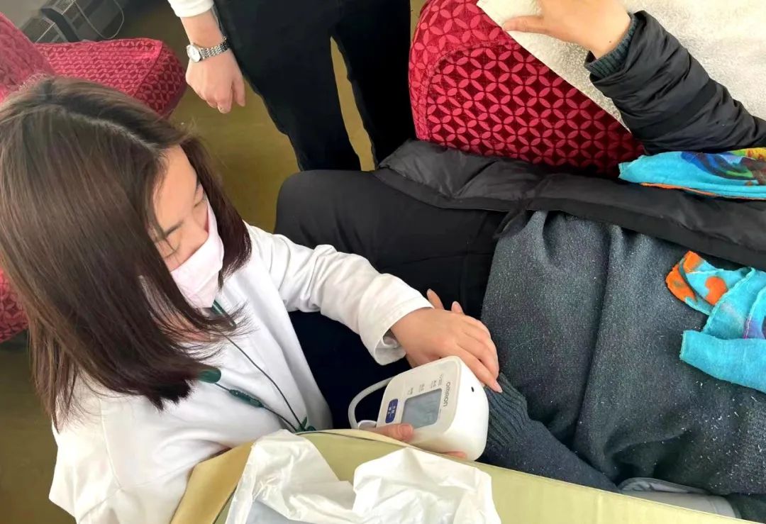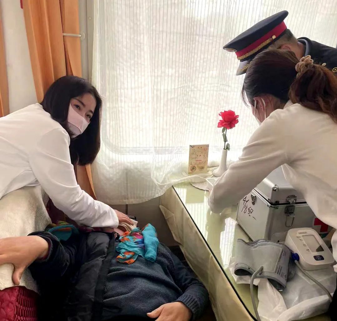 當(dāng)列車疾馳20多分鐘后,劉炎炎突然發(fā)現(xiàn)座位對(duì)面的阿姨大汗淋漓、臉色蒼白,很是痛苦。出于職業(yè)的敏感性,她立即上前詢問(wèn)情況。阿姨說(shuō)自己心慌,胸口悶,喘不上來(lái)氣。