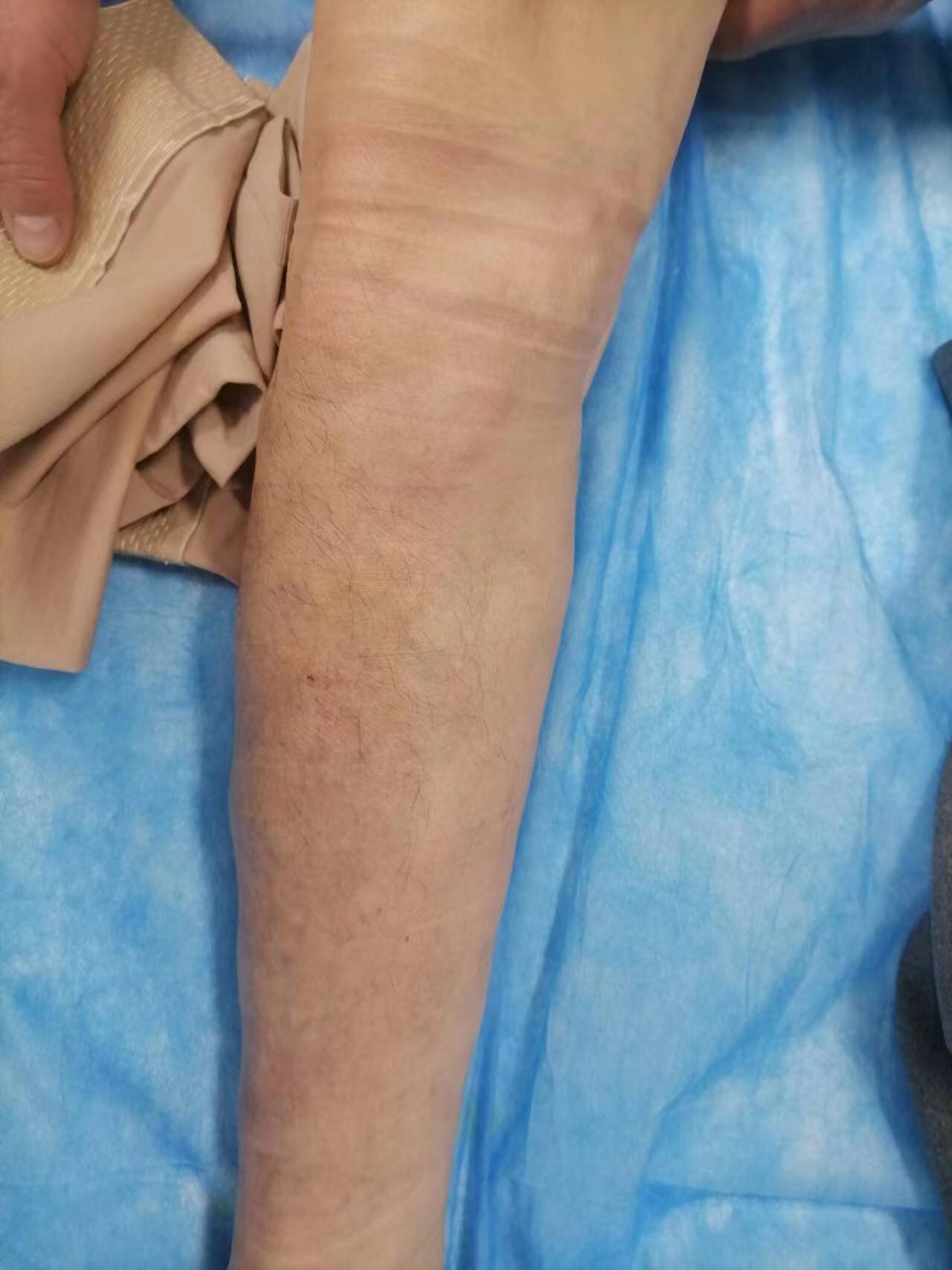 患者為中年女性,周口市鹿邑縣人,長期從事重體力勞作,雙下肢靜脈曲張3年多,活動后下肢酸脹,剛開始覺得不痛不癢,不算什么事,便沒放在心上,更沒有去醫(yī)院就診。1年前,張某小腿下段皮膚瘙癢明顯,久站久立后酸脹加重,皮膚變黑變硬,才引起重視,自行在藥店買了一些外用藥膏,使用后效果不佳。多方打聽后,來到市二院介入科找到主治醫(yī)師趙進科,根據(jù)患者病情,完善相關(guān)檢查后,診斷為下肢靜脈曲張,臨床分期為C4a期。趙進科結(jié)合患者檢查結(jié)果,決定給予雙下肢迂曲靜脈、大隱靜脈新型泡沫硬化治療,術(shù)中患者沒有任何不適感,術(shù)后即可起身獨立行走。