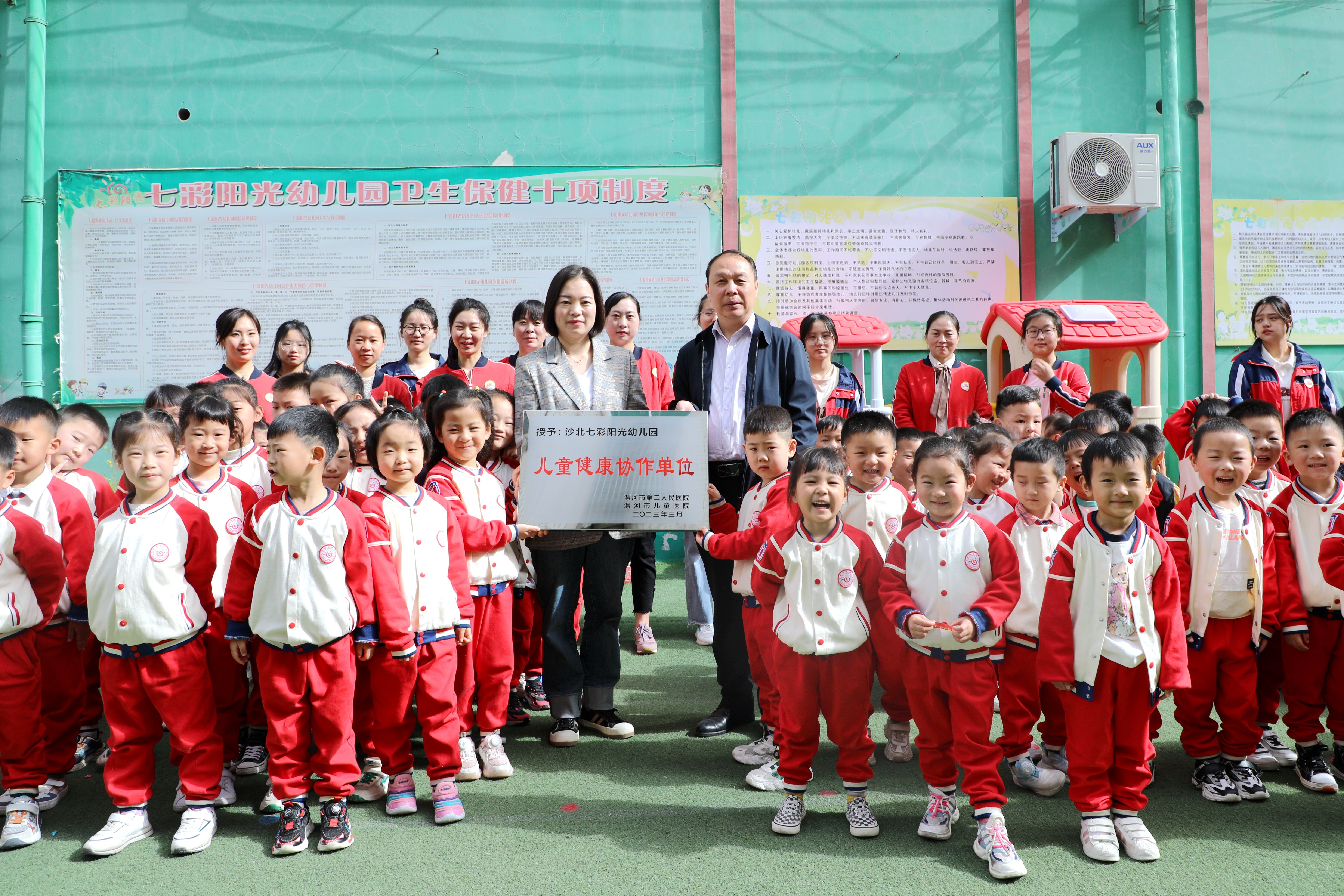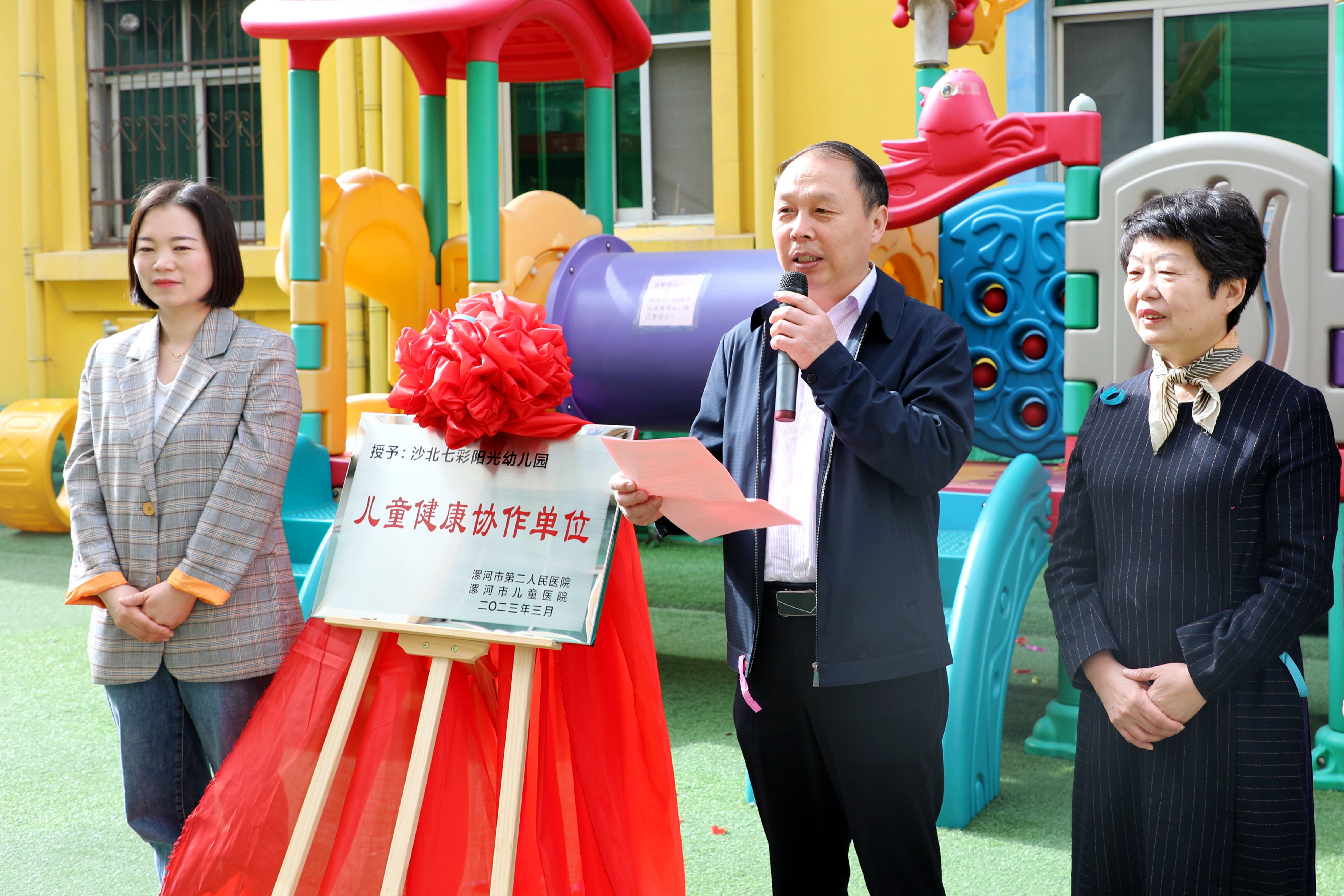 少年強則國強,少年智則國智。為了推動醫(yī)教融合,全面保障少年兒童的身心健康,4月11日上午,漯河市第二人民醫(yī)院(市兒童醫(yī)院、市口腔醫(yī)院)紀委書記孟德陽、兒科(兒童醫(yī)療中心)主任蘇愛芳、眼科主任李立、口腔科護士長周翔等一行,來到郾城區(qū)七彩陽光幼兒園,與該園結對“聯(lián)姻”——舉行兒童健康協(xié)作單位揭牌儀式。