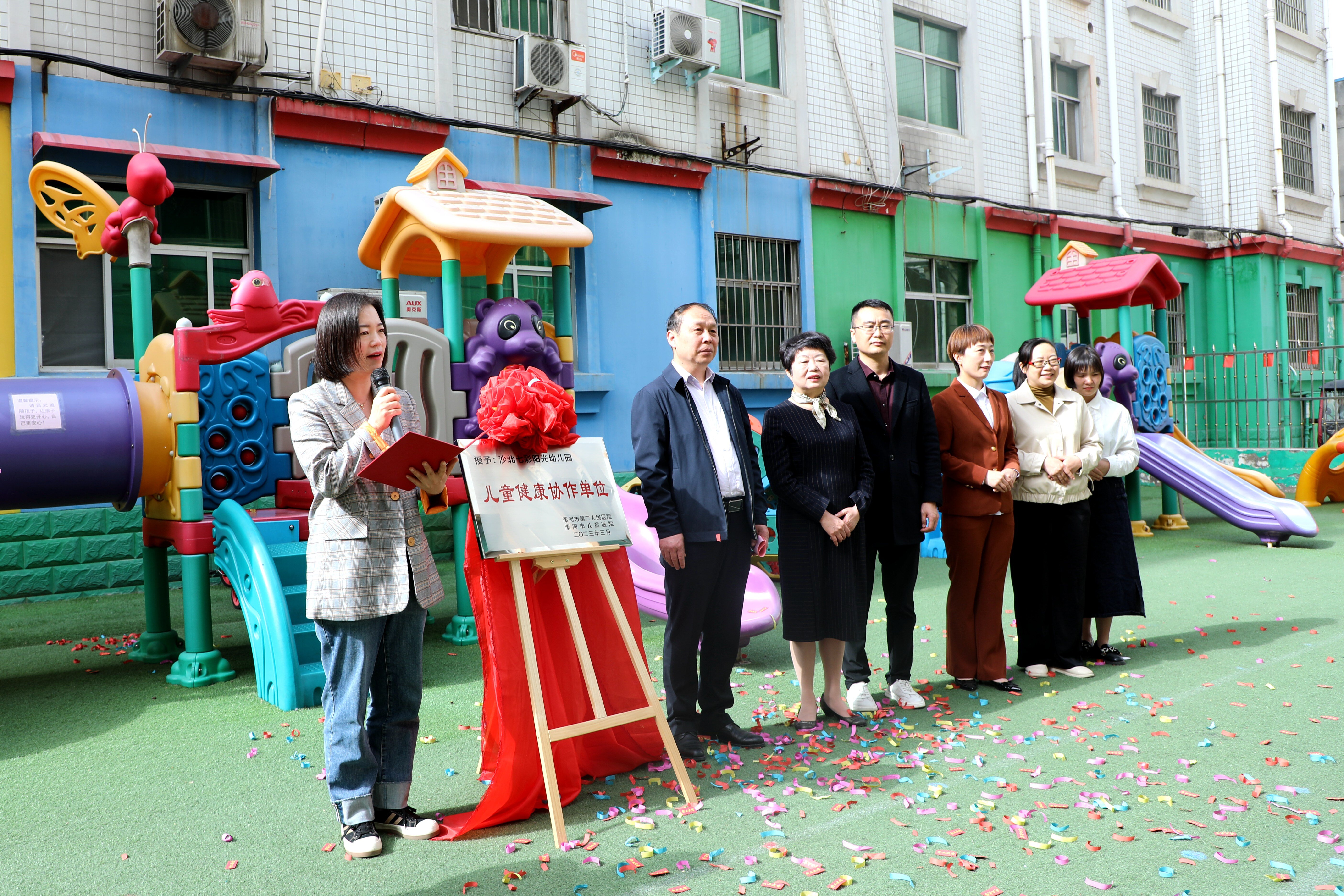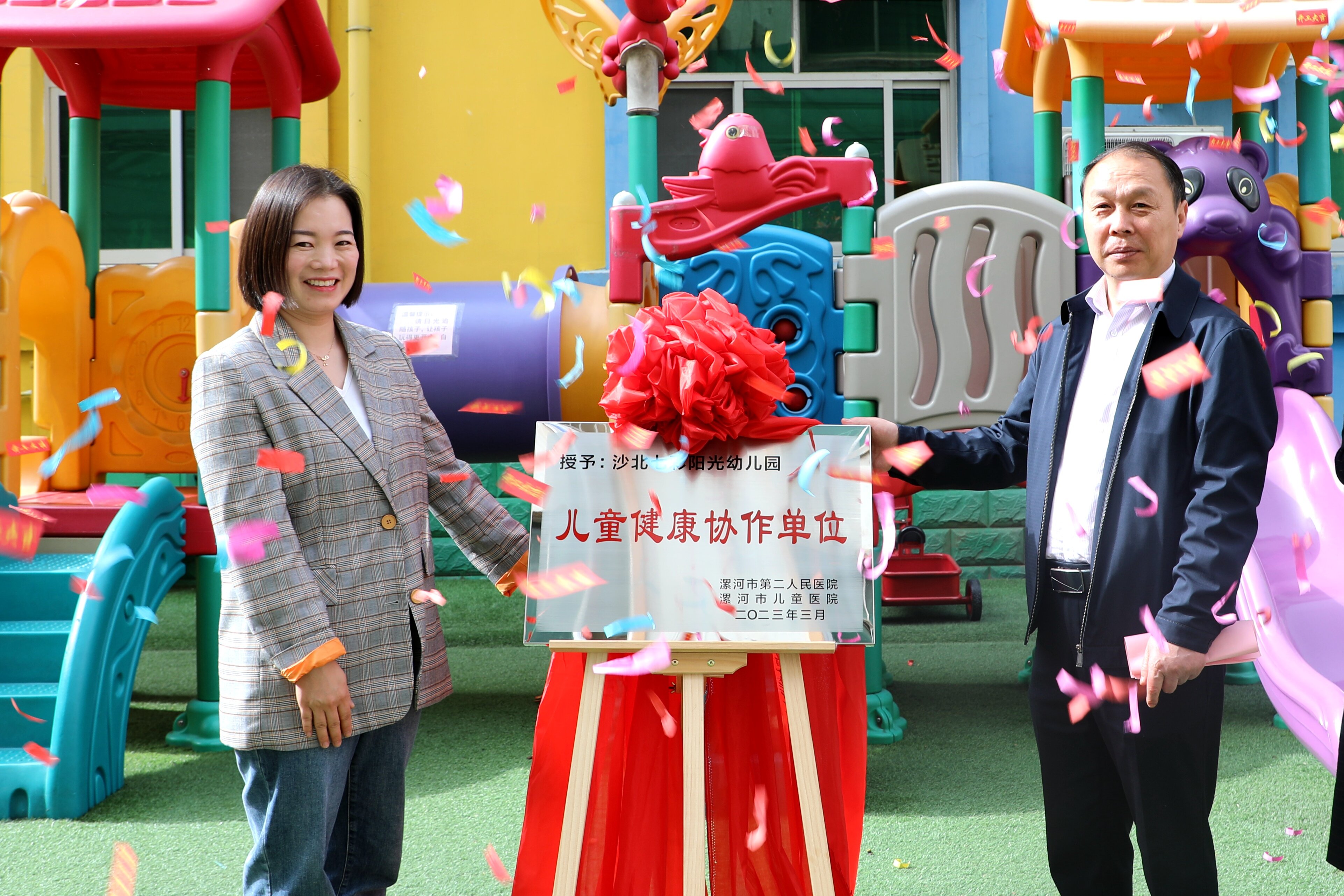 儀式現(xiàn)場,市二院紀委書記孟德陽與七彩陽光幼兒園園長郭丹丹共同為“兒童健康協(xié)作單位”揭牌。