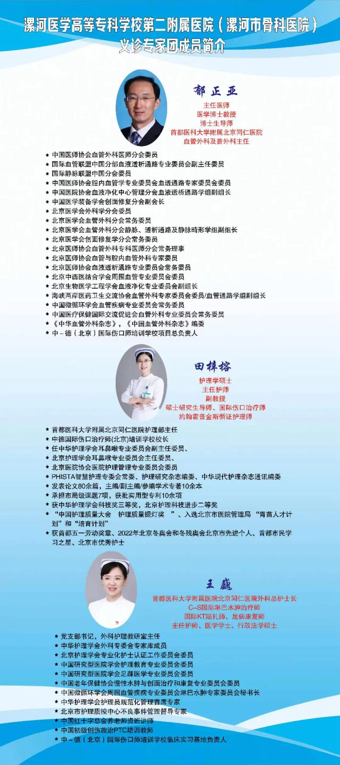 為了提升慢性傷口治療水平,增強(qiáng)醫(yī)護(hù)人員服務(wù)技能,強(qiáng)化“早診斷、早治療、早康復(fù)”的診療意識(shí),為患者提供更加科學(xué)、規(guī)范化的醫(yī)療服務(wù),漯河市骨科醫(yī)院(漯河醫(yī)專二附院)將于4月22日特邀中德傷口治療師(北京)培訓(xùn)學(xué)校專家蒞漯開展“星火傳承公益行”漯河站活動(dòng)。屆時(shí),中德國(guó)際傷口治療師培訓(xùn)學(xué)校校長(zhǎng)、首都醫(yī)科大學(xué)附屬北京同仁醫(yī)院護(hù)理部主任田梓蓉,中德國(guó)際傷口治療師(北京)培訓(xùn)學(xué)校項(xiàng)目負(fù)責(zé)人、首都醫(yī)科大學(xué)附屬北京同仁醫(yī)院血管外科主任郁正亞,中-德國(guó)際傷口治療師(北京)培訓(xùn)學(xué)校教學(xué)負(fù)責(zé)人、首都醫(yī)科大學(xué)附屬北京同仁醫(yī)院護(hù)理部護(hù)士長(zhǎng)李飛, 中-德國(guó)際傷口治療師(北京)培訓(xùn)學(xué)校實(shí)習(xí)基地負(fù)責(zé)人、首都醫(yī)科大學(xué)附屬北京同仁醫(yī)院外科總護(hù)士長(zhǎng)王巍,中-德國(guó)際傷口治療師(北京)培訓(xùn)學(xué)??倢?dǎo)師、首都醫(yī)科大學(xué)附屬北京同仁醫(yī)院傷口治療中心護(hù)士長(zhǎng)張欣等專家將聯(lián)合漯河市骨科醫(yī)院(漯河醫(yī)專二附院)院長(zhǎng)李奎、吳廣良副院長(zhǎng)、副院長(zhǎng)曹鵬克、足踝外科主任陳宏峰、創(chuàng)傷骨科一病區(qū)主任甄相周、急診科主任任紅瑞、傷口造口失禁淋巴水腫??崎T診負(fù)責(zé)人成瀚等聯(lián)合開展“傷愈歸來(lái) 專業(yè)同行”主題學(xué)術(shù)交流會(huì)和大型義診活動(dòng)。