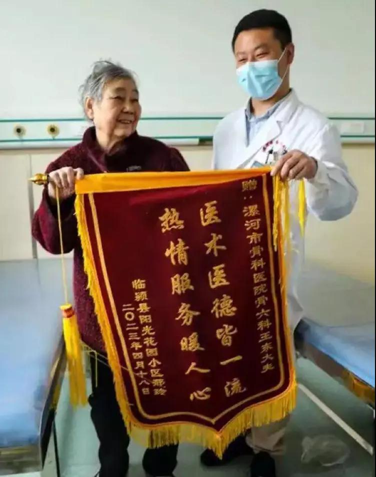 網(wǎng)易河南4月22日報道(周惠杰 通訊員 賈慶申 李芳) 4月22日上午,臨潁縣一老人將“醫(yī)術醫(yī)德皆一流 熱情服務暖人心”的錦旗,送到漯河市骨科醫(yī)院骨六科主治醫(yī)生王東的手中,感謝醫(yī)生及其護理團隊近日來對她的精心治療和護理。