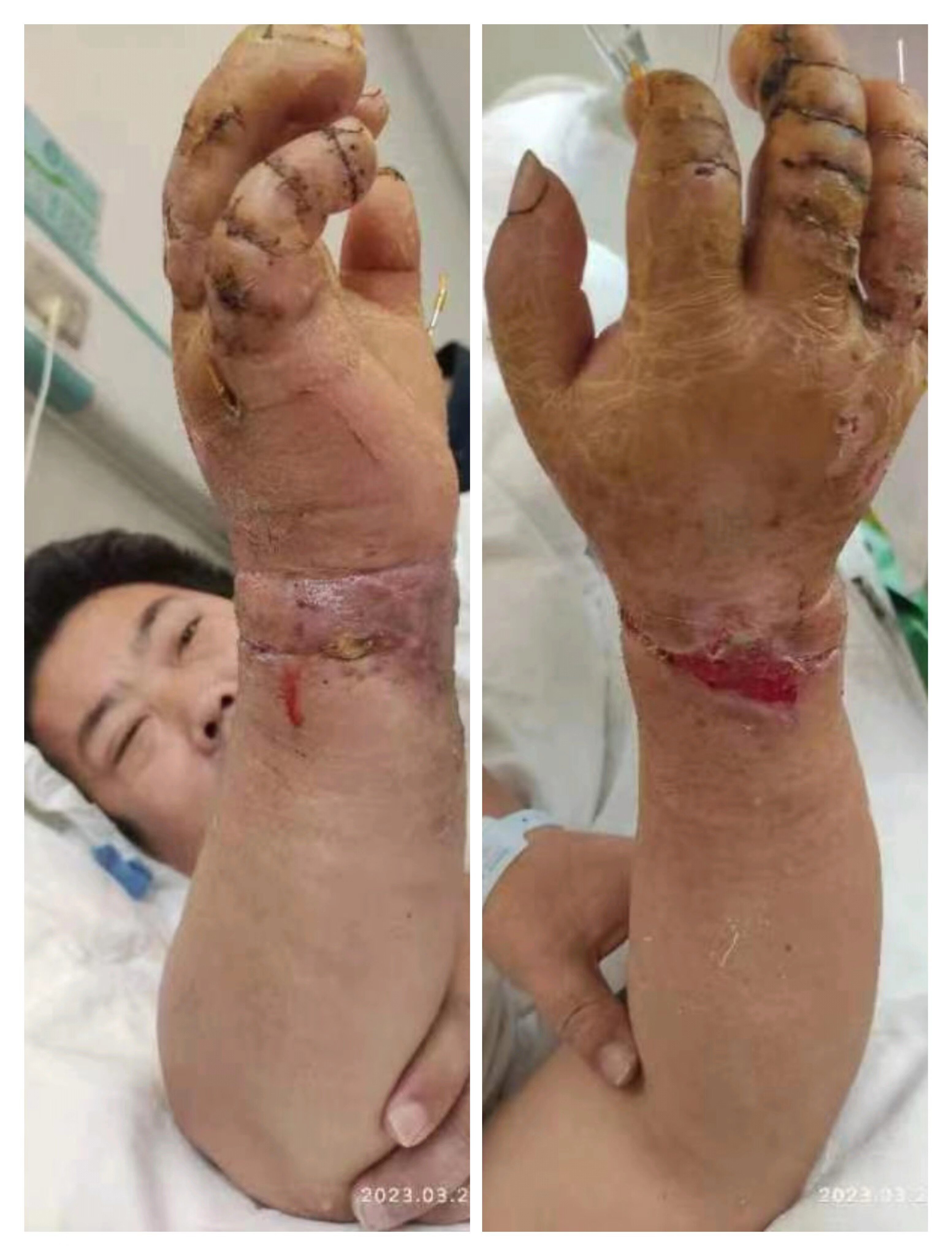 1個(gè)小時(shí)后李先生被家屬?gòu)呐R穎送到市二院,顯微手足外科主任沈衛(wèi)軍迅速安排患者進(jìn)入搶救室,查體發(fā)現(xiàn)右前臂遠(yuǎn)端毀損,僅剩幾根屈肌腱相連,基本完全離斷,而且右手2—5指被切了十幾段。