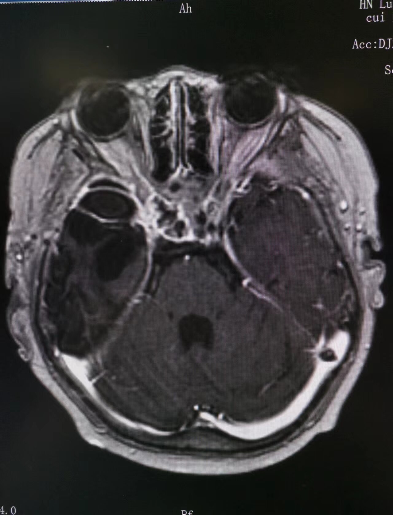 隨后,患兒開始進(jìn)行三維放療,經(jīng)過13次治療后,患兒每日晨起出現(xiàn)短暫復(fù)明,雙眼光感較前好轉(zhuǎn)。放療結(jié)束,患兒病情較之前明顯好轉(zhuǎn),目前患兒病情得到有效控制,整個(gè)治療過程患者無任何不適。