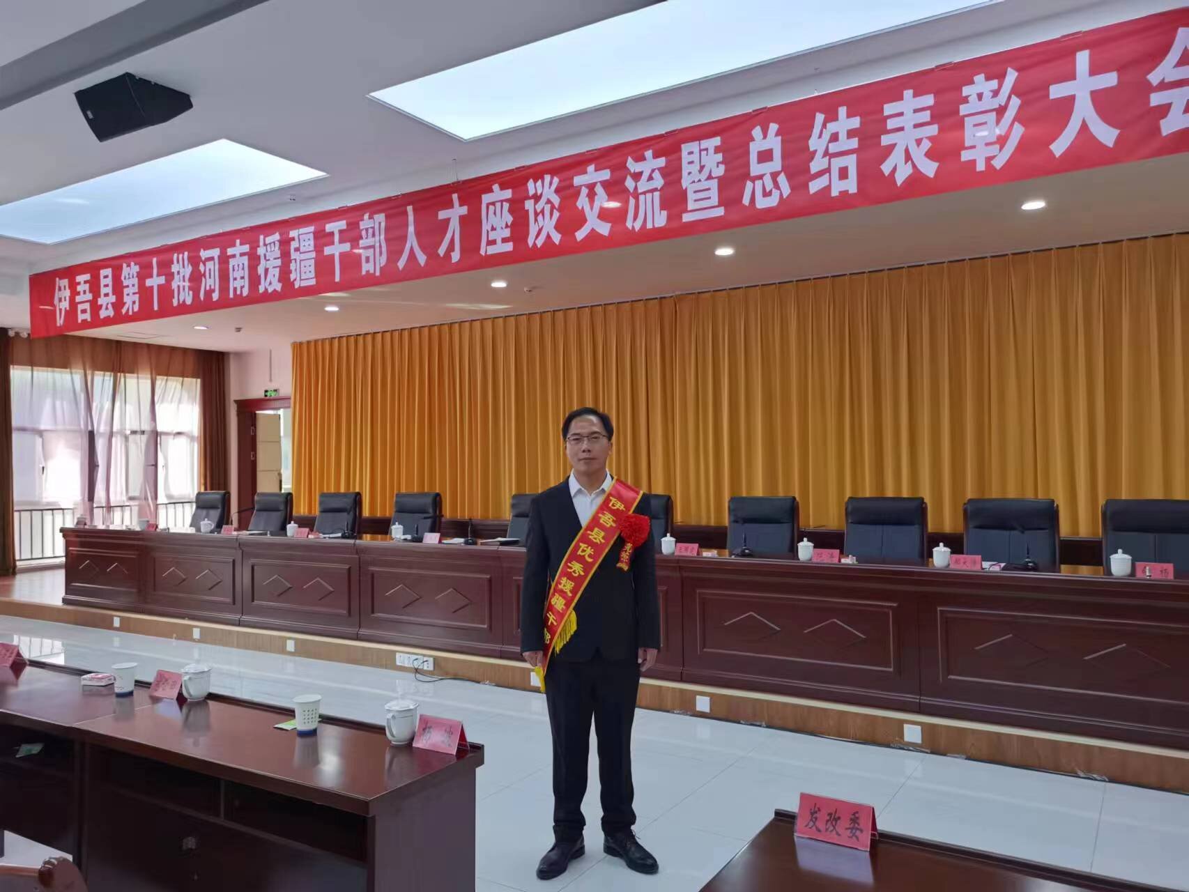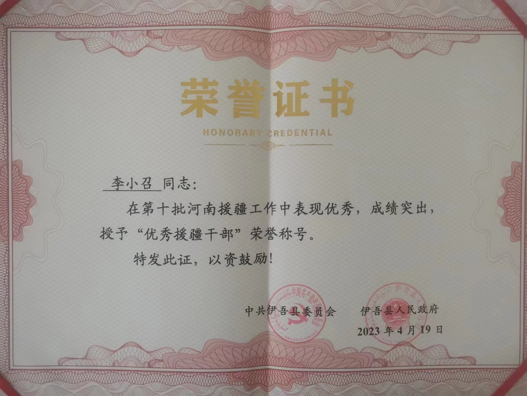 李小召同志于2021年9月作為我市第十批援疆干部赴新疆哈密市伊吾縣人民醫(yī)院開展對口支援工作,在近兩年的工作生活中,該同志以過硬的業(yè)務(wù)素質(zhì),扎實的工作作風(fēng),認(rèn)真負(fù)責(zé)地投入援疆工作,以高度的政治責(zé)任感和使命感出色完成了任務(wù),展示了肯吃苦、能奉獻的二院良好形象,以實際行動助力了當(dāng)?shù)貎嚎频目焖侔l(fā)展,交出一份優(yōu)異的答卷,得到當(dāng)?shù)卣歪t(yī)院的充分肯定,被伊吾縣委縣政府授予第十批“優(yōu)秀援疆干部”、伊吾縣“榮譽縣民”,被伊吾縣人民醫(yī)院授予“優(yōu)秀援疆專家”榮譽稱號。