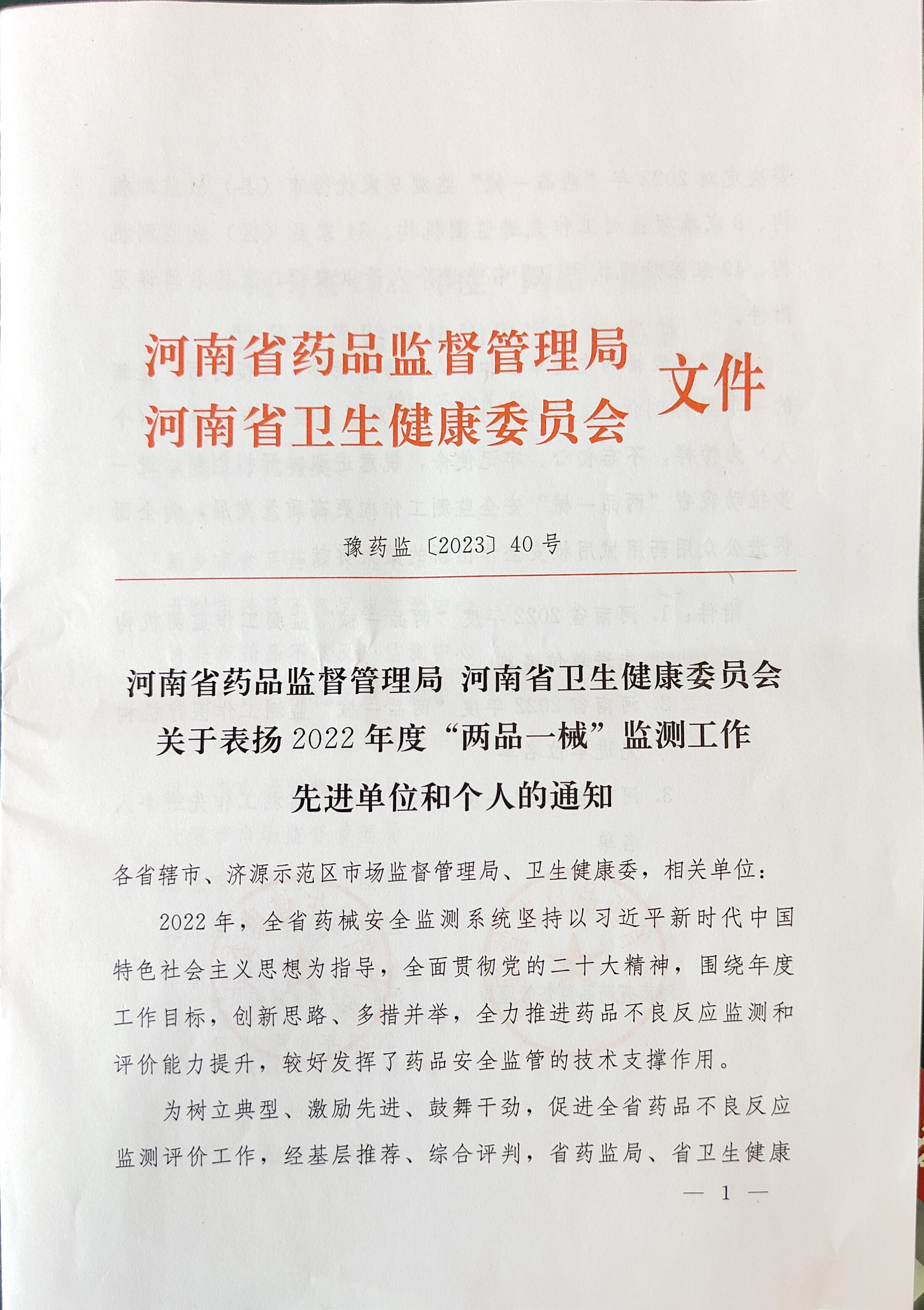 近日,市二院分別榮獲河南省2022年度“兩品一械”監(jiān)測工作先進單位、漯河市2022年度“兩品一械”監(jiān)測工作先進單位。