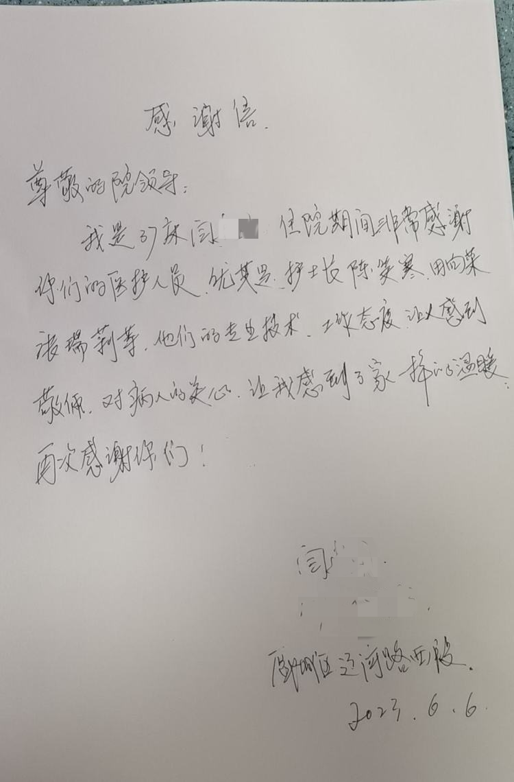 在泌尿外科(肛腸科)全體醫(yī)護們的悉心照料下,6月6日下午,這名女士的家人順利辦理出院,他激動地說:“謝謝你們,為全體醫(yī)生、護士點贊,千言萬語表達不了我的感激之情。真的感謝你們!謝謝!”說完他提起紙筆,用一封感謝信來抒發(fā)他的誠摯謝意。