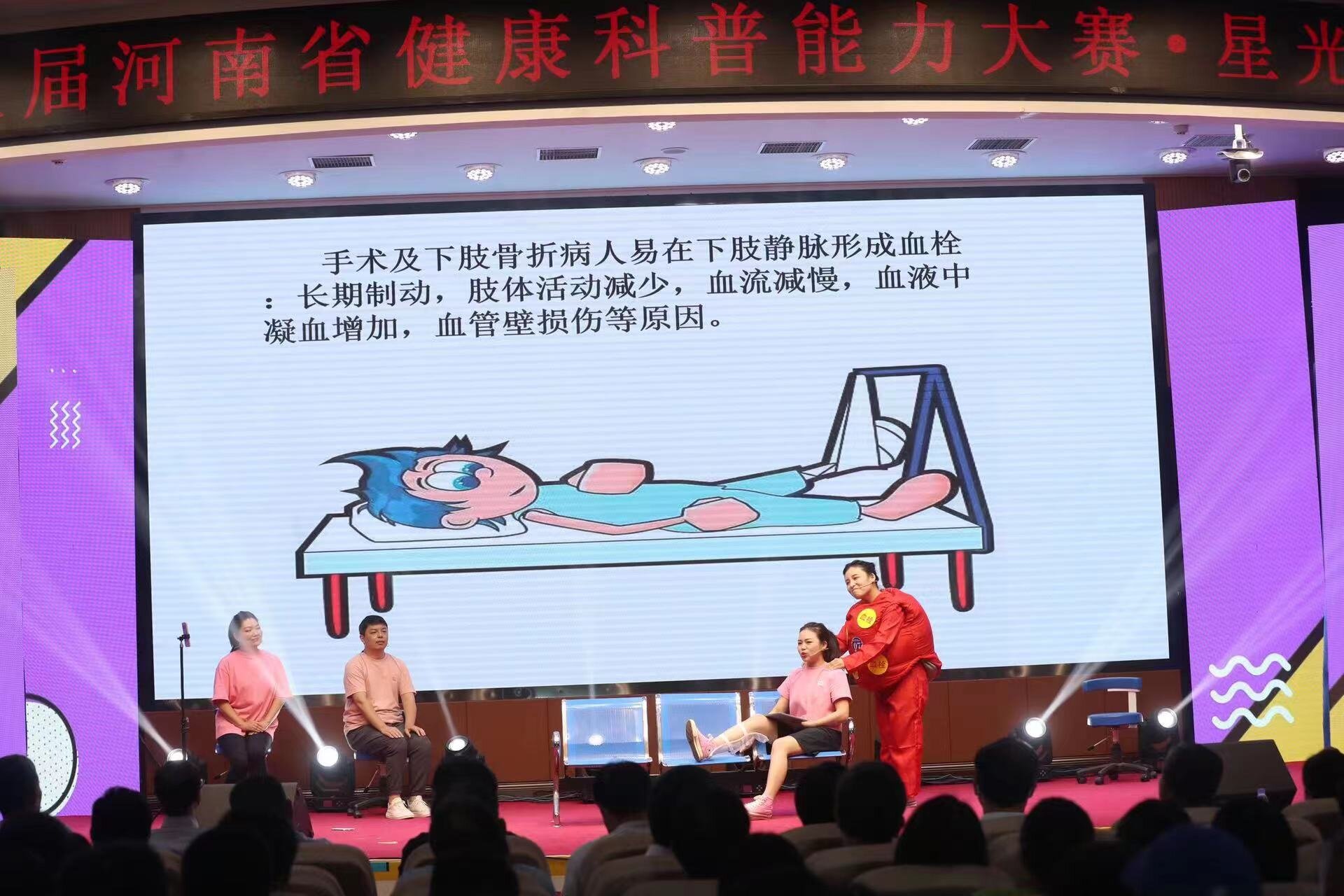 近日,在河南省衛(wèi)生健康委、河南省科技廳、河南省總工會、河南省科協(xié)與河南日報社聯(lián)合主辦,河南省疾病預(yù)防控制中心、大河健康報社聯(lián)合承辦的第五屆河南省健康科普能力大賽上,由市二院選送的作品《當(dāng)血栓來敲門》,從全省數(shù)千部內(nèi)容優(yōu)質(zhì)、形式活潑的健康科普作品中脫穎而出,該作品從院賽到市賽,再到省賽,幾經(jīng)打磨,最終一路披荊斬棘,斬獲金獎。