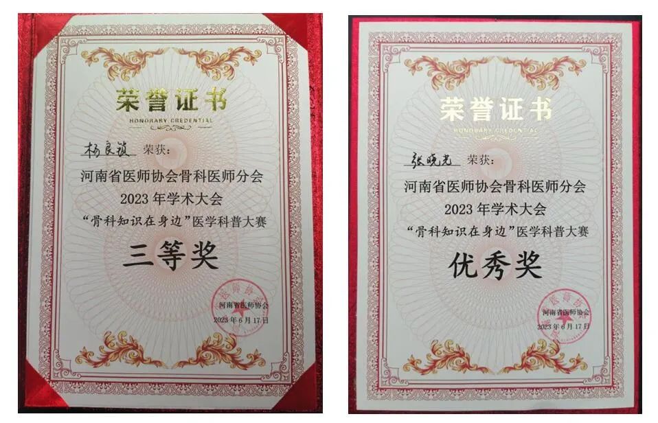 在“骨科知識(shí)在身邊”醫(yī)學(xué)科普大賽環(huán)節(jié),楊良鎖、張曉光分獲三等獎(jiǎng)、優(yōu)秀獎(jiǎng)。