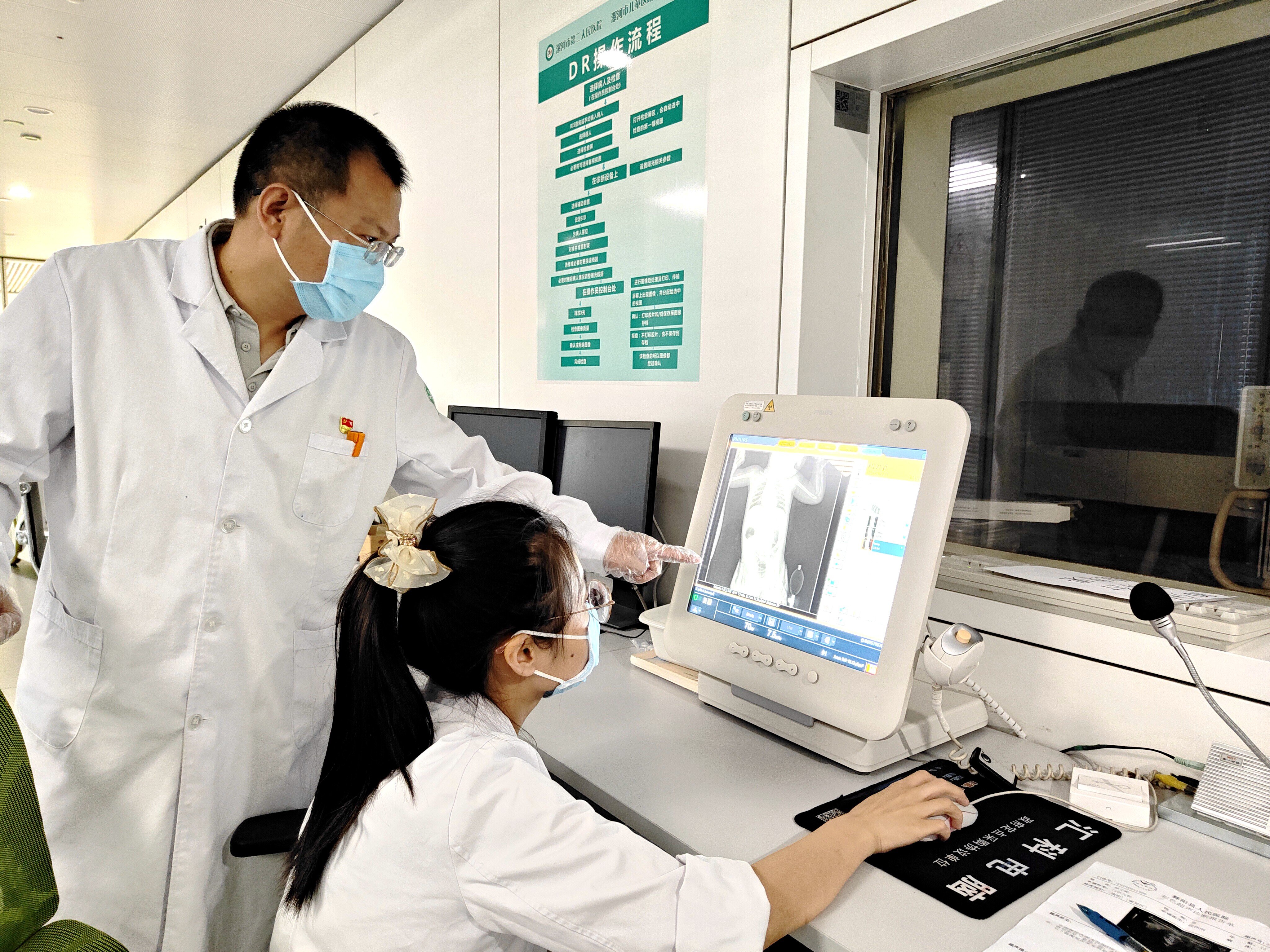 副主任郭俊濤、技師戴亞麗在家屬的共同配合下為患兒進行腸套疊空氣灌腸復(fù)位治療。