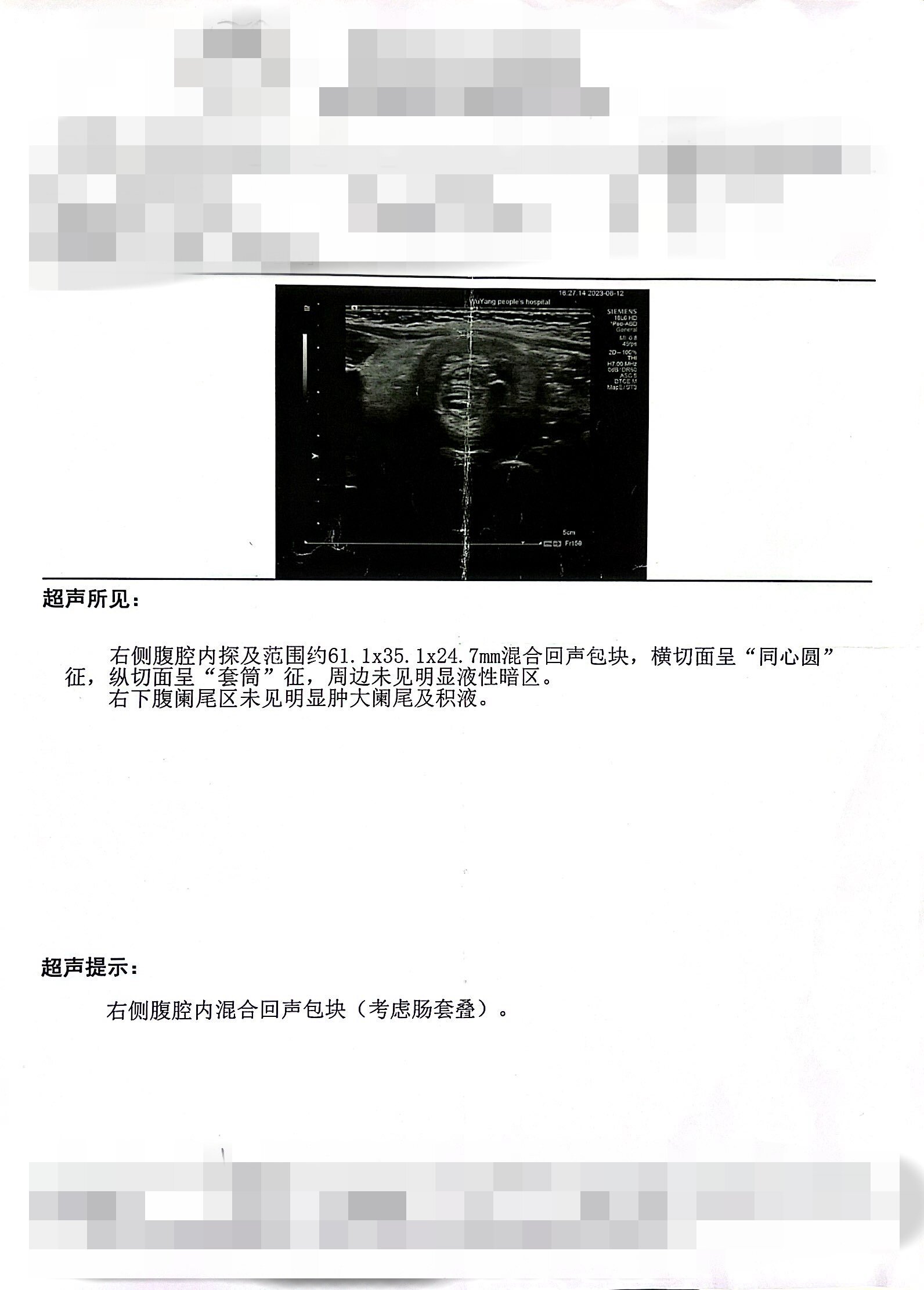市二院小兒外科病區(qū)走廊上傳來呼喊聲,“醫(yī)生、醫(yī)生,快看看俺的孩子,我們是從舞陽專程來咱醫(yī)院的!”值班醫(yī)生馬露芳查看發(fā)現(xiàn),患兒精神萎靡、哭鬧不止,詢問家屬得知,孩子上午就開始一陣一陣哭鬧,午后哭鬧次數(shù)增多,肚子發(fā)脹,在當(dāng)?shù)蒯t(yī)院就診,檢查彩超提示:61×30×25mm混合回聲包塊,套筒長軸約60mm,考慮腸套疊。
