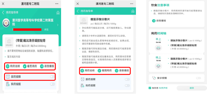 小程序同時具備語音播報、看圖用藥、服藥提醒等功能,可滿足老年人、視障人士等不同人群的個性化需求。醫(yī)院也可利用官方微信公眾號、小程序等平臺向患者推送用藥指導信息,為患者提供用藥教育、用藥科普等服務,指導督促患者規(guī)律服藥。