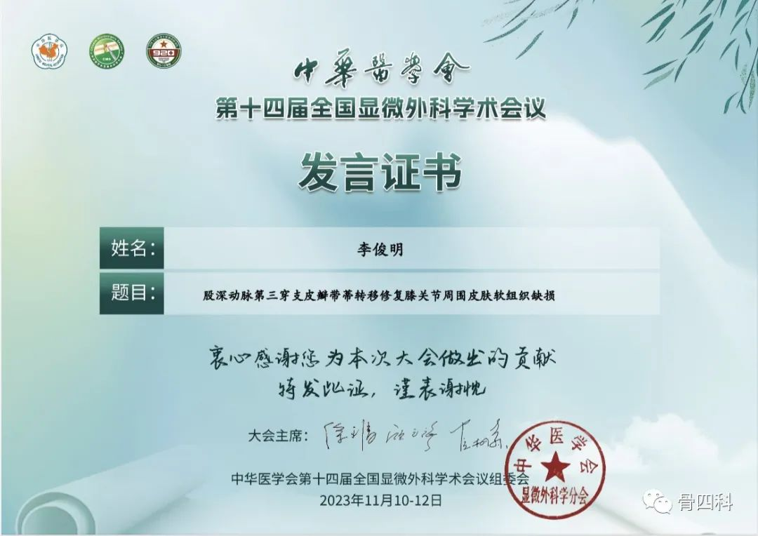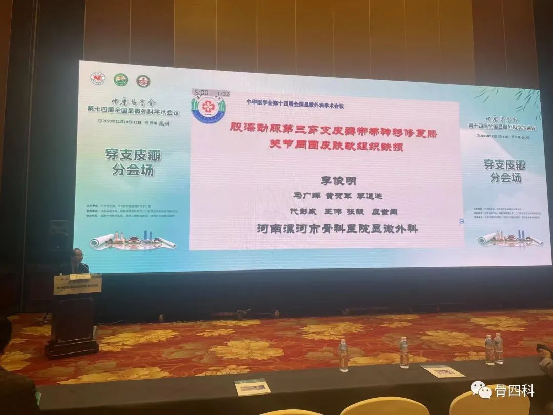在穿支皮瓣分會(huì)場(chǎng),李俊明就《股深動(dòng)脈第三穿支皮瓣帶蒂轉(zhuǎn)移修復(fù)膝關(guān)節(jié)周圍皮膚軟組織缺損》作主題演講,并和同仁們展開討論。