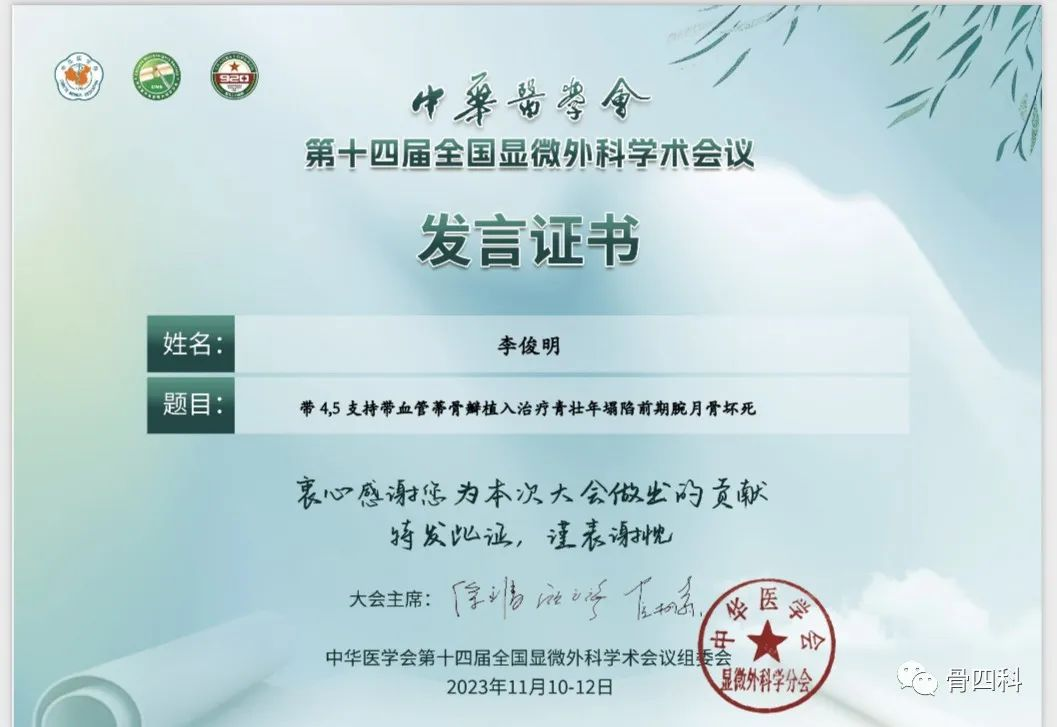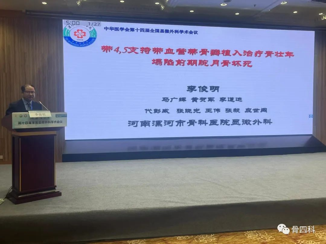 在骨顯微修復(fù)分會(huì)場(chǎng),李俊明就《帶四、五支持帶血管蒂骨瓣植入治療青壯年塌陷前期腕月骨壞死》展開精彩發(fā)言。
