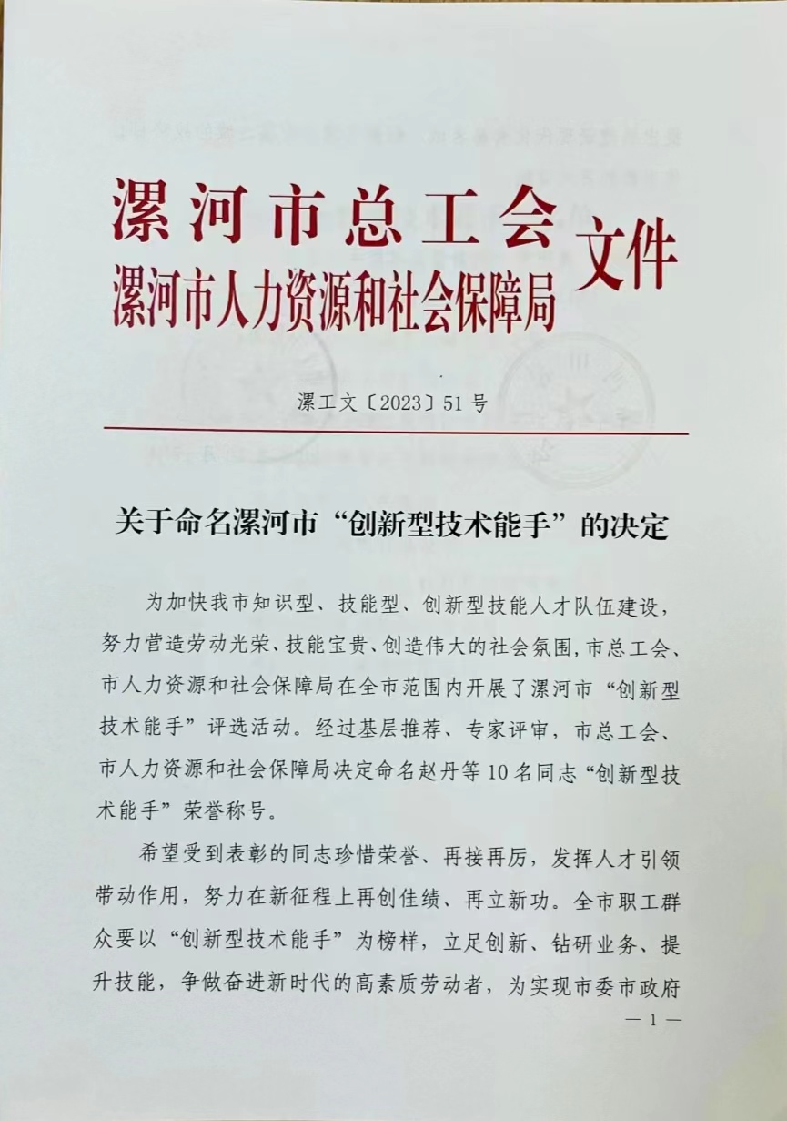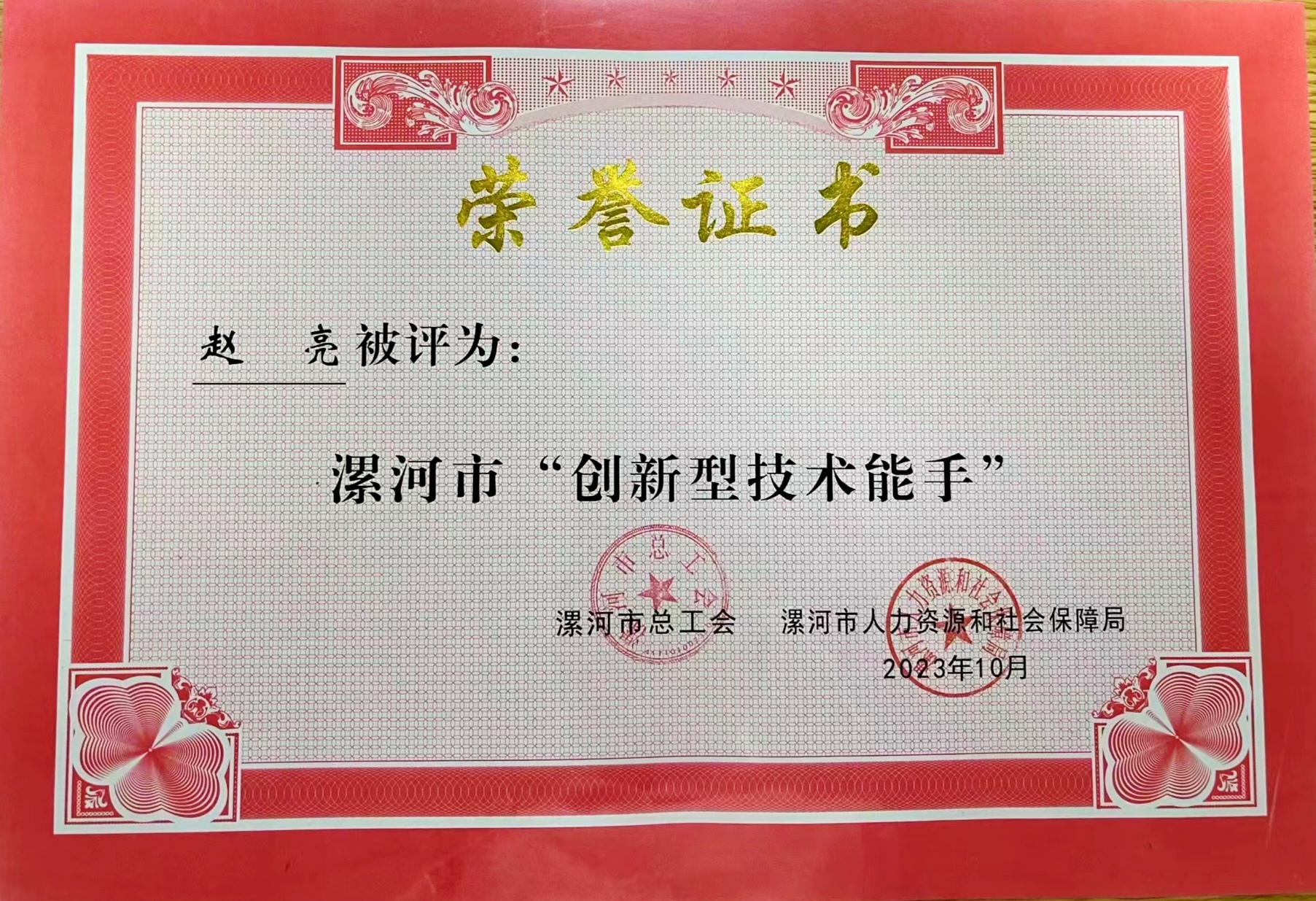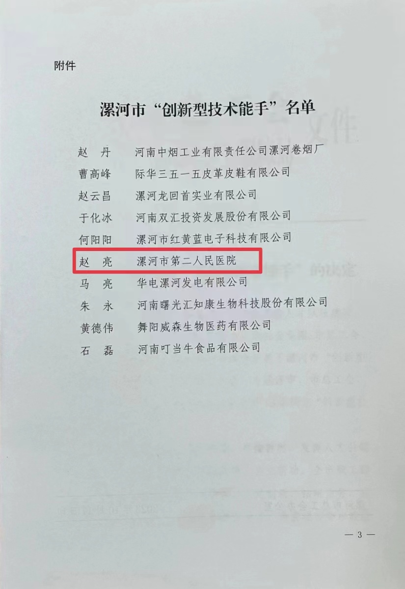 近日,漯河市人力資源局和社會(huì)保障局、漯河市總工會(huì)聯(lián)合印發(fā)《關(guān)于命名漯河市“創(chuàng)新型技術(shù)能手”的決定》(漯工文[2023]51號),經(jīng)過基層推薦、專家評審,全市10名同志受到表彰,其中市二院放療科副主任趙亮榮獲漯河市“創(chuàng)新型技術(shù)能手”稱號。
