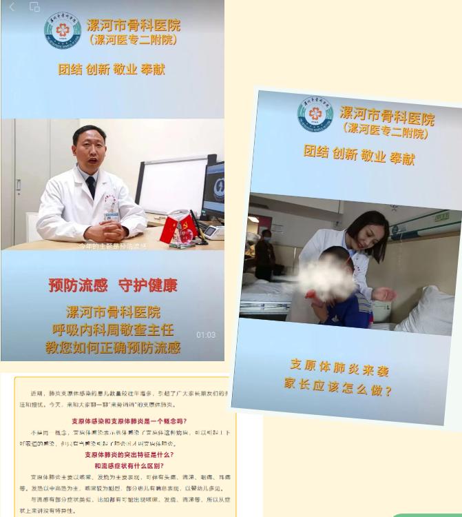 入秋以來呼吸道疾病高發(fā),醫(yī)院結(jié)合日常工作經(jīng)驗,不斷加強公眾教育和健康宣傳。邀請兒科、呼吸內(nèi)科等科室的多位專家錄制科普視頻,并利用視頻號、抖音號等多平臺向公眾發(fā)布健康宣教知識。同時,向各科室征集健康科普文章,通過漯河市骨科醫(yī)院微信公眾平臺及省市級媒體進行發(fā)布,多渠道向公眾普及兒童常見疾病的預(yù)防和治療知識,為支原體肺炎的預(yù)防和應(yīng)急處理提供支持,提高家長們的健康意識和應(yīng)對能力。
