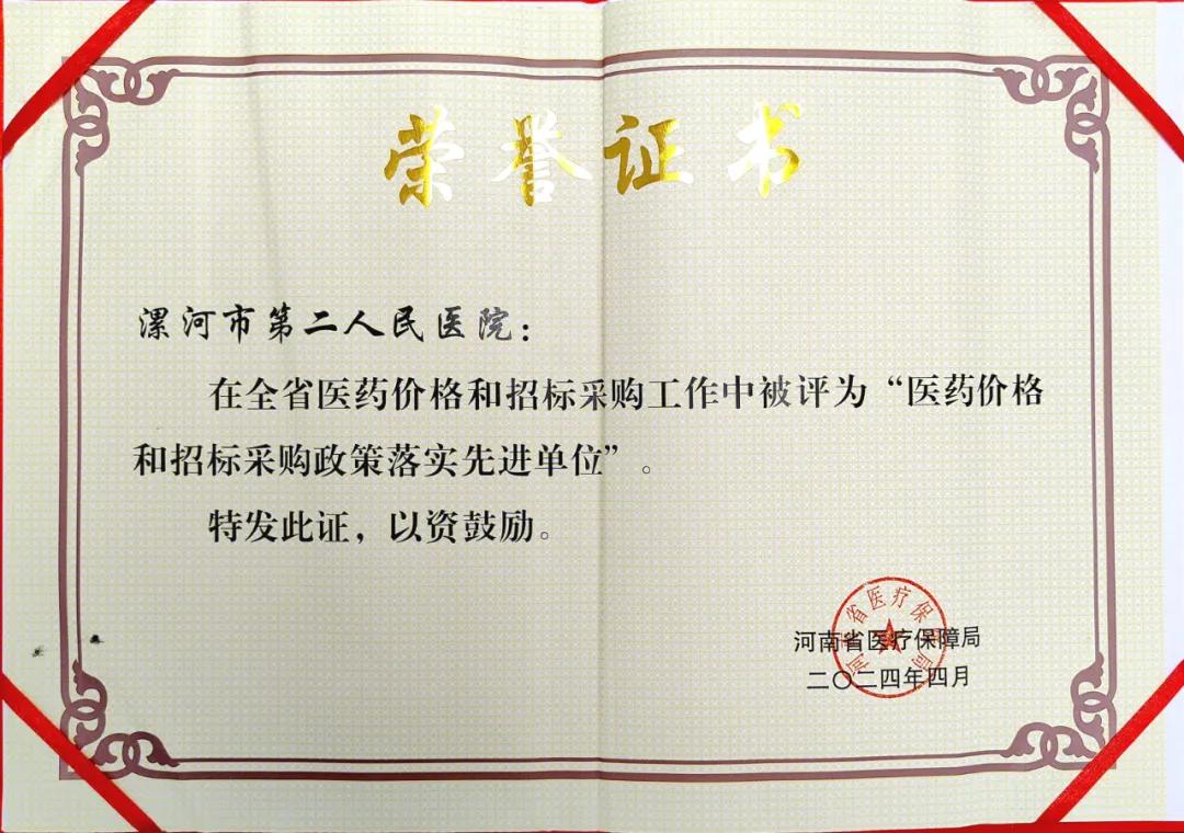 近日,市二院在全省醫(yī)藥價格和招標(biāo)采購工作綜合評價中,被河南省醫(yī)療保障局評為“醫(yī)藥價格和招標(biāo)采購政策落實先進單位”。