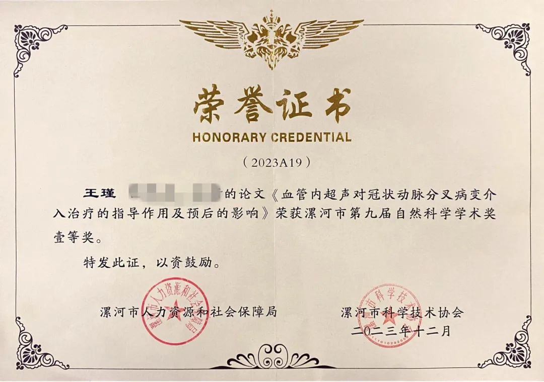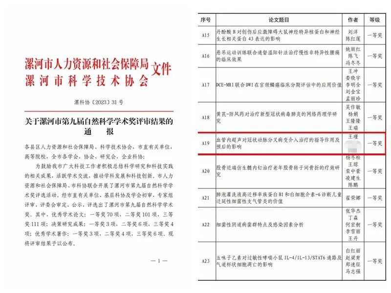近日,漯河市人力資源和社會保障局、漯河市科學(xué)技術(shù)協(xié)會公布漯河市第九屆自然科學(xué)學(xué)術(shù)獎優(yōu)秀學(xué)術(shù)論文評選結(jié)果。市二院院長王瑾《血管內(nèi)超聲對冠狀動脈分叉病變介入治療的指導(dǎo)作用及預(yù)后的影響》、《血管內(nèi)超聲指導(dǎo)經(jīng)皮冠狀動脈介入治療非 ST 段抬高型急 性冠狀動脈綜合征臨界病變患者的效果》分別榮獲一等獎和二等獎;中醫(yī)針灸科主任朱青霞《玉屏風(fēng)散合牽正散加減聯(lián)合透滯針治療周圍性面癱療效觀察》榮獲二等獎;腫瘤科副主任醫(yī)師翟中武《FOLFOX 方案聯(lián)合吉非替尼治療晚期食管癌療效評價》、顯微外科主治醫(yī)師劉東博的《指掌側(cè)固有動脈背側(cè)支皮瓣修復(fù)對手指皮膚缺損者血清炎性因子的影響》榮獲三等獎。