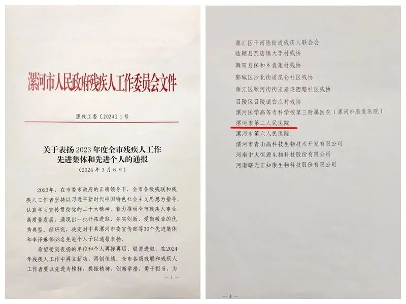 3月6日,漯河市人民政府殘疾人工作委員會發(fā)布《關(guān)于表揚2023年度全市殘疾人工作先進集體和先進個人的通報》,市二院榮獲“2023年度全市殘疾人工作先進集體”榮譽稱號。