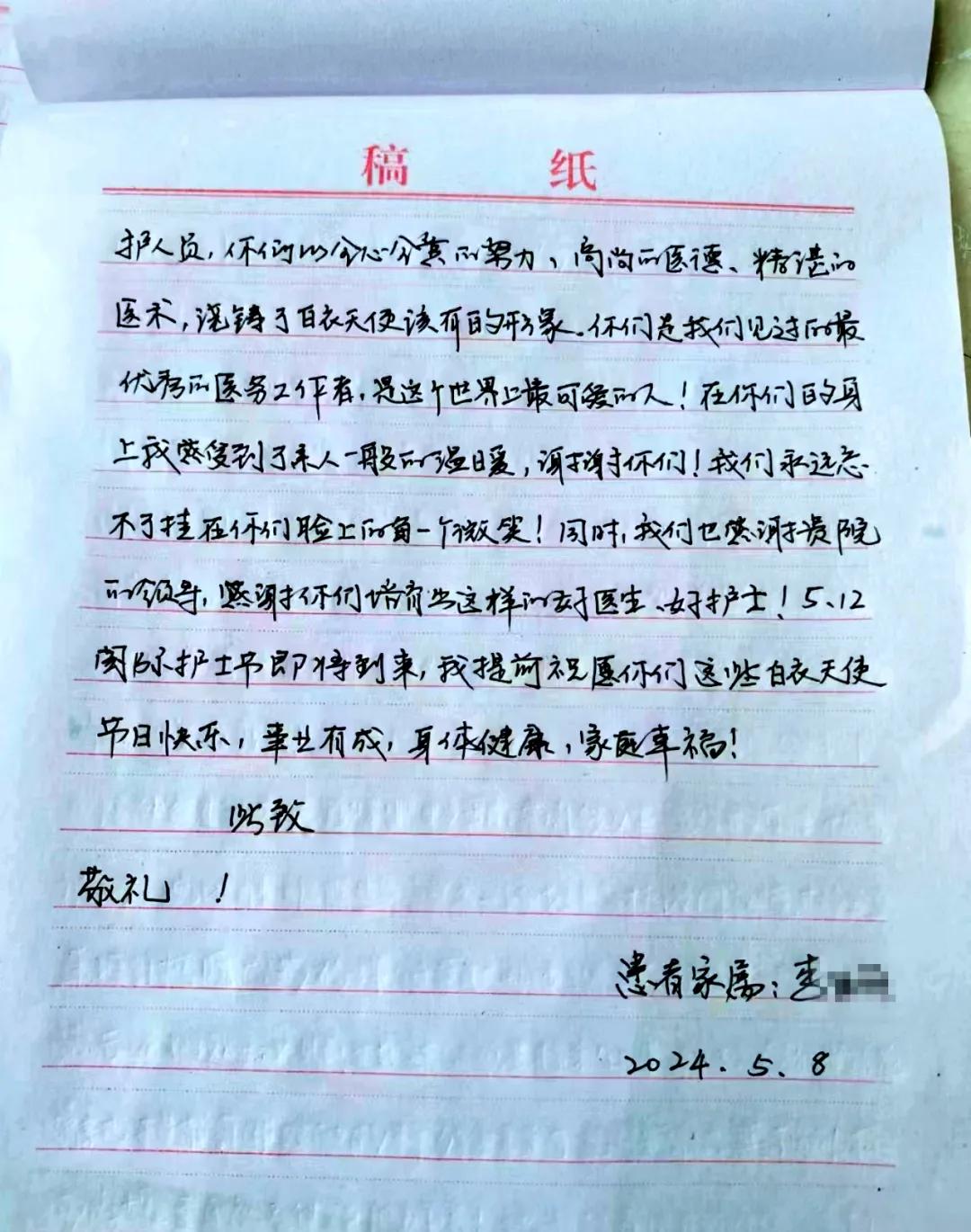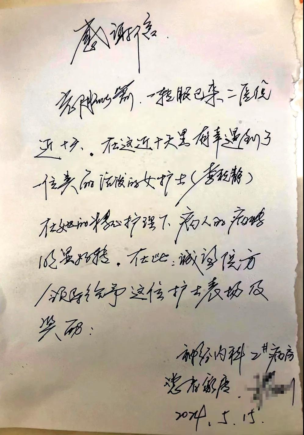 患者張女士長(zhǎng)期受困于癱瘓狀態(tài),無法正常行走與進(jìn)食,且伴有四肢肌張力異常增高的癥狀。在呂杰民主任與曹軍軍醫(yī)生共同制定的精確治療方案下,以及護(hù)理團(tuán)隊(duì)持續(xù)、細(xì)致地照料,患者病情得到顯著改善。為感謝護(hù)士李秋靜在住院期間對(duì)患者提供的無微不至的關(guān)懷,5月15日,在即將出院之際,患者家屬將一封感謝信送到科室,以表達(dá)由衷的感激之情。