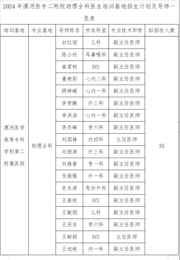 為深入貫徹落實(shí)《關(guān)于印發(fā)助理全科醫(yī)生培訓(xùn)實(shí)施意見(試行)的通知》(國(guó)衛(wèi)科教發(fā)〔2016〕14 號(hào)),根據(jù)《河南省衛(wèi)生健康委關(guān)于做好2024年助理全科醫(yī)生培訓(xùn)招收工作的通知》(豫衛(wèi)科教函〔2024〕19號(hào))要求,結(jié)合本院實(shí)際,現(xiàn)制定漯河醫(yī)學(xué)高等??茖W(xué)校第二附屬醫(yī)院2024年助理全科醫(yī)生培訓(xùn)招收方案如下: