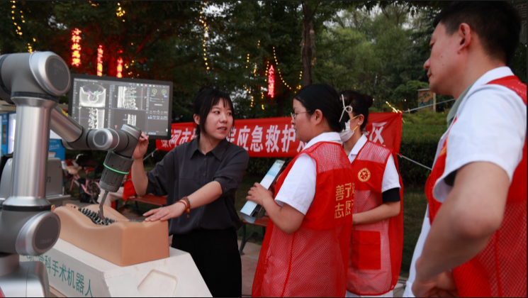 除了提供義診服務(wù)外,醫(yī)療專(zhuān)家志愿者們還進(jìn)行了“天璣Ⅱ”骨科機(jī)器人展示,向市民介紹了該機(jī)器人在數(shù)字智能醫(yī)療領(lǐng)域的應(yīng)用、技術(shù)特點(diǎn)、臨床優(yōu)勢(shì)以及實(shí)際案例等方面內(nèi)容,將優(yōu)質(zhì)的醫(yī)療資源和先進(jìn)的醫(yī)療技術(shù)帶到基層老百姓身邊。