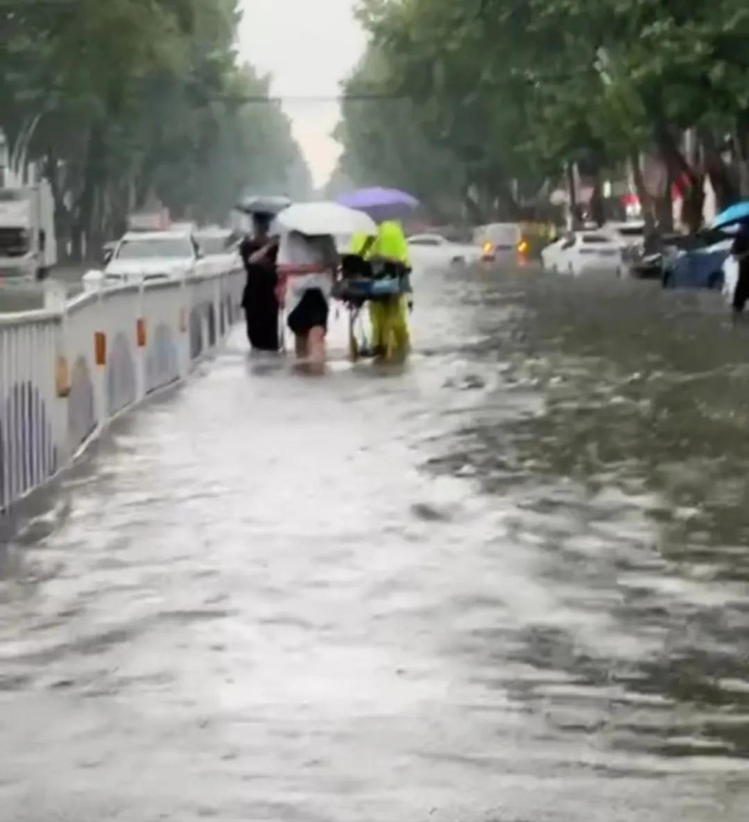 圖為急診科醫(yī)務(wù)人員在積水路段接診患者
