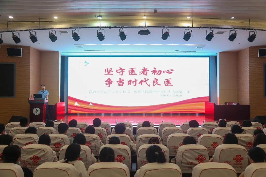 柴運洪以“堅守醫(yī)者初心、爭當時代良醫(yī)”為題,對2023級、2024級全體助理全科醫(yī)生進行思政教育。開篇引用了習(xí)近平總書記在中國醫(yī)師節(jié)慰問全國廣大醫(yī)務(wù)工作者時的重要指示“廣大醫(yī)務(wù)工作者是推動衛(wèi)生健康事業(yè)發(fā)展的重要力量。要堅持人民至上、生命至上,崇尚醫(yī)德、鉆研醫(yī)術(shù)、秉持醫(yī)風、勇?lián)厝?,努力促進醫(yī)學(xué)進步,為建設(shè)健康中國、增進人民健康福祉作出新貢獻。”