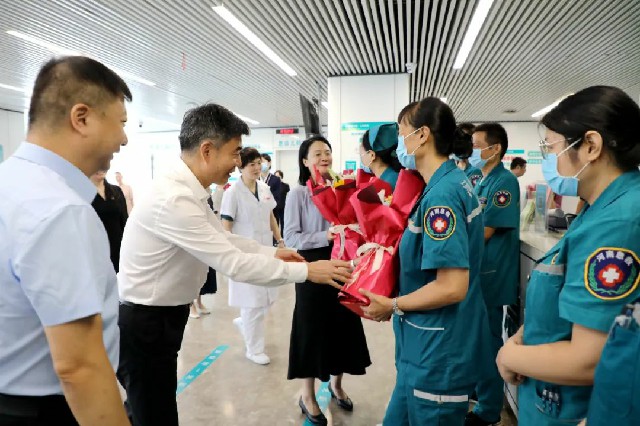 在急診科,宋耀生書記、于宏副主任向急救人員送上鮮花,對他們在急救救援和保障人民生命健康方面所做出的貢獻(xiàn)表示肯定。“急診科是衛(wèi)健系統(tǒng)和醫(yī)院的前沿陣地,你們時刻待命,聞令出擊,為患者救治爭分奪秒,大家辛苦了!”領(lǐng)導(dǎo)的話語溫暖著每一位急診醫(yī)師的心。