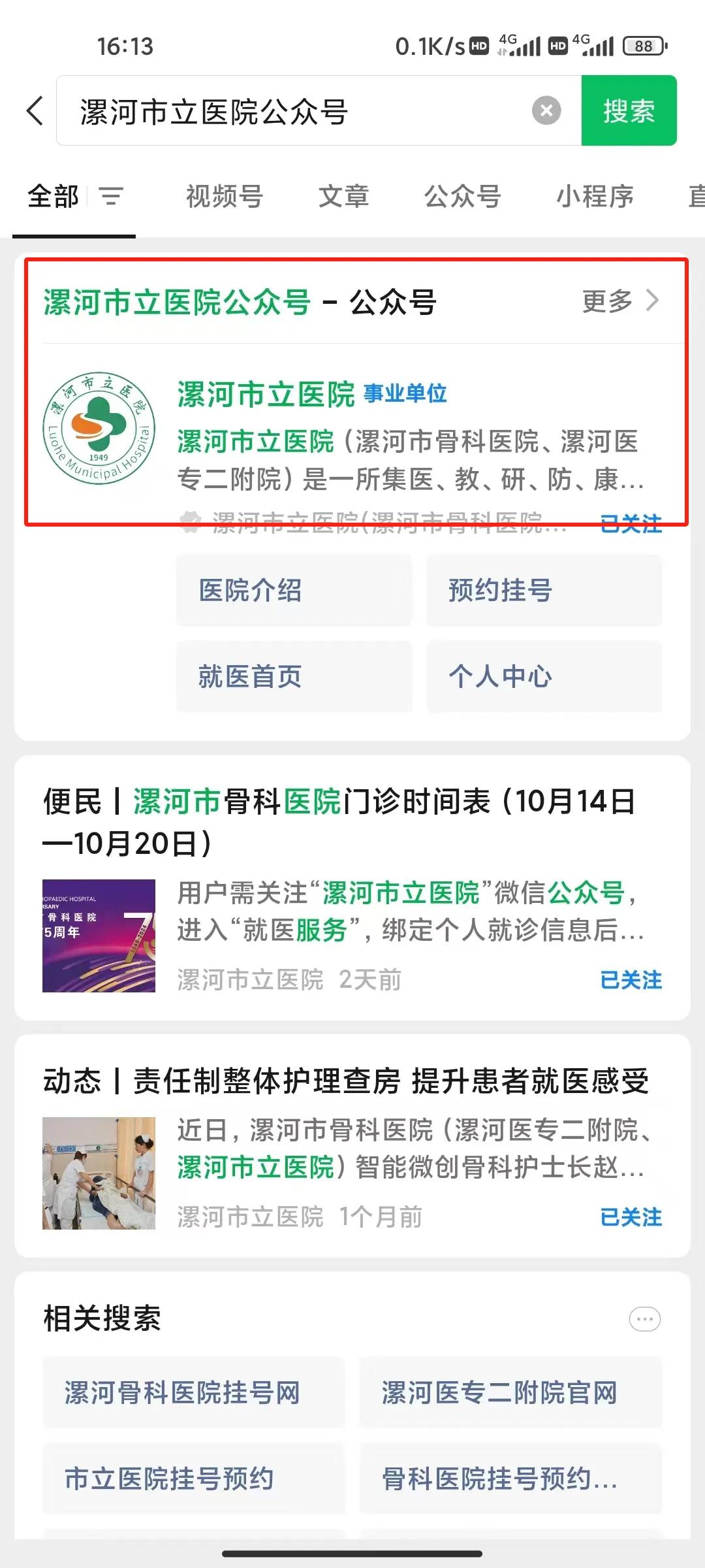 01、進(jìn)入微信主界面,搜索公眾號(hào)-【漯河市立醫(yī)院公眾號(hào)】并關(guān)注。