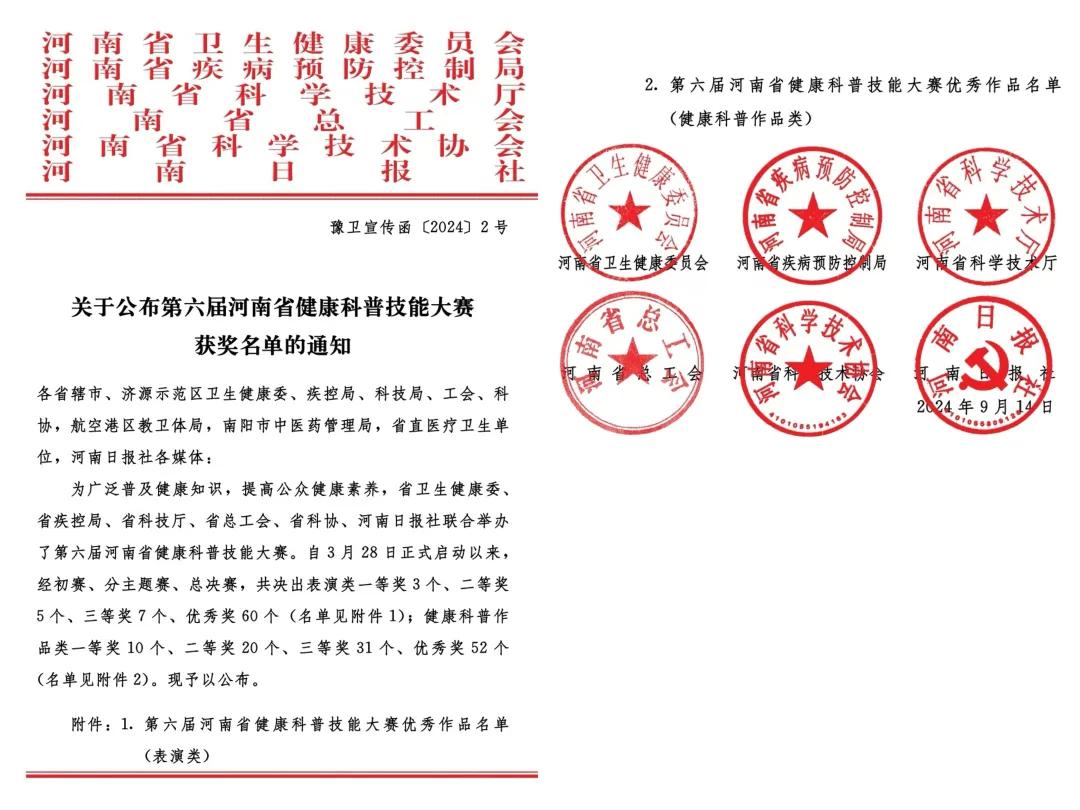 近日,由河南省衛(wèi)生健康委、河南省疾病預防控制局、河南省科技廳、河南省總工會、河南省科協(xié)、河南日報社聯(lián)合主辦、河南省疾病預防控制中心、大河健康報聯(lián)合承辦的第六屆河南省健康科普技能大賽圓滿落下帷幕。