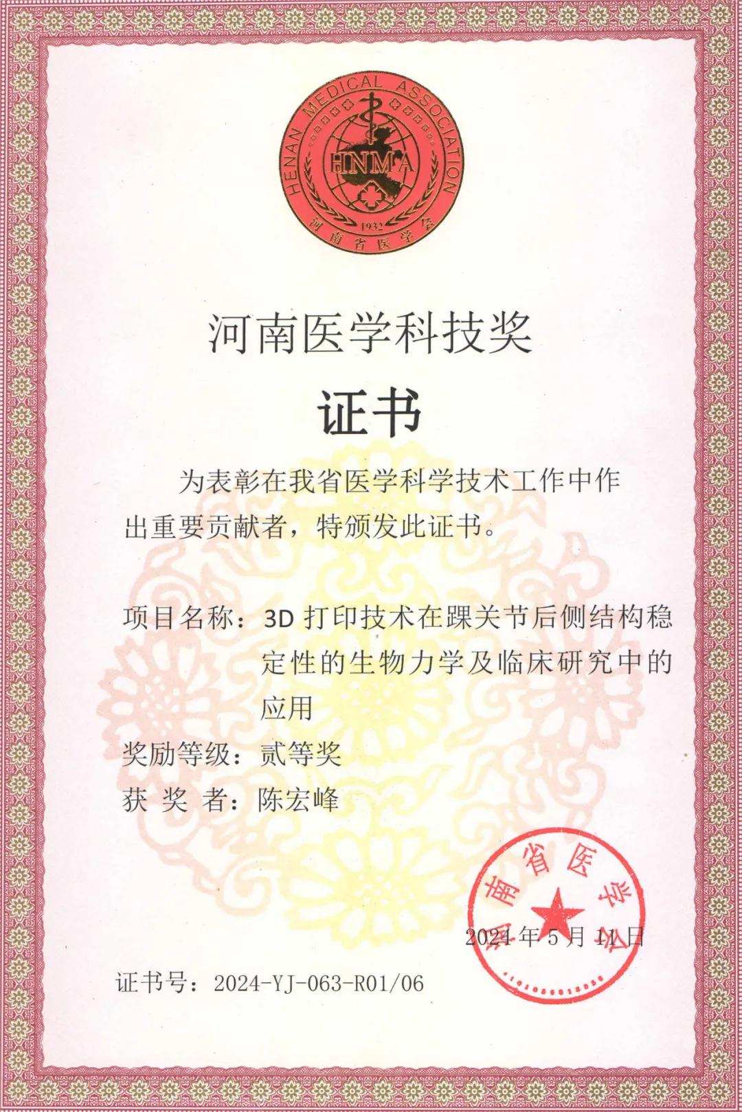 在陳宏峰主任帶領下,2012年起,在豫中南地區(qū)率先開展踇外翻、平足癥、高弓足畸形的規(guī)范化矯治。2012年完成豫中南第一例自體韌帶重建治療踝關節(jié)外側(cè)韌帶陳舊性損傷,2019年完成豫中南第一例踝上截骨術(SMO)治療踝關節(jié)骨性關節(jié)炎,2020年完成豫中南第一例軟骨移植術(AOT)治療距骨軟骨損傷。2021年完成豫中南第一例人工全踝關節(jié)置換術治療終末期踝關節(jié)骨性關節(jié)炎,2024年開展人工跖趾關節(jié)置換治療踇外翻、類風濕關節(jié)炎足,相繼開展了脛骨橫向骨搬運術治療糖尿病足,應用骨科手術機器人結(jié)合髓內(nèi)釘微創(chuàng)治療踝關節(jié)骨折、跟骨骨折,踝關節(jié)鏡下微創(chuàng)修復踝關節(jié)外側(cè)韌帶損傷等領先技術,在豫中南地區(qū)享有盛譽。