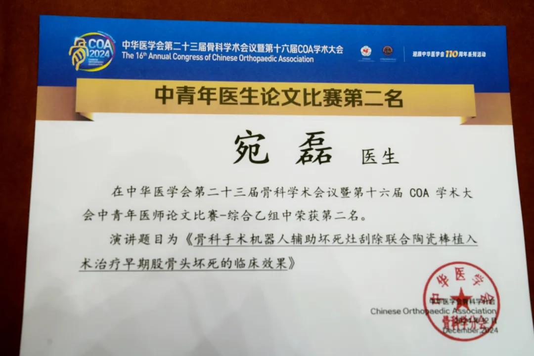 智能微創(chuàng)骨科(骨十)宛磊主任 在中青年醫(yī)生論文比賽-綜合乙組(二)會(huì)場(chǎng)進(jìn)行參賽發(fā)言,最終以《骨科手術(shù)機(jī)器人輔助壞死灶刮除聯(lián)合陶瓷棒植入術(shù)治療早期股骨頭壞死的臨床效果 》為題獲得中青年論文比賽第二名。