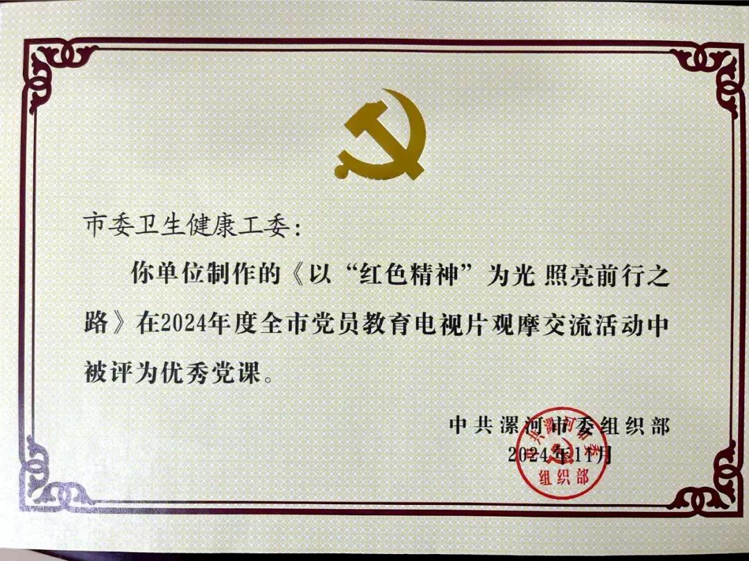 近日,中共漯河市委組織部開展的2024年度全市黨員教育電視片觀摩交流活動獲獎名單新鮮出爐,市二院藥學(xué)黨支部報送的微視頻《以“紅色精神”為光 照亮前行之路》被評為優(yōu)秀黨課。