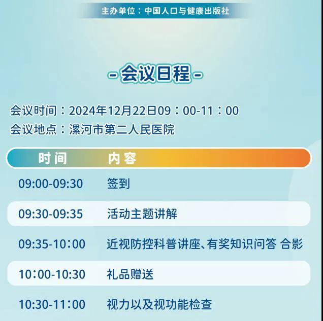 12月22日上午9:00(本周日),追光行動-兒童青少年近視防控科普講座將在漯河市第二人民醫(yī)院眼科門診舉辦,屆時將有眼科專家為青少年兒童及家長奉上一場精彩的科普講座,進行免費現(xiàn)場咨詢指導(dǎo)。誠摯邀請感興趣的兒童及家長朋友們前來參與活動。