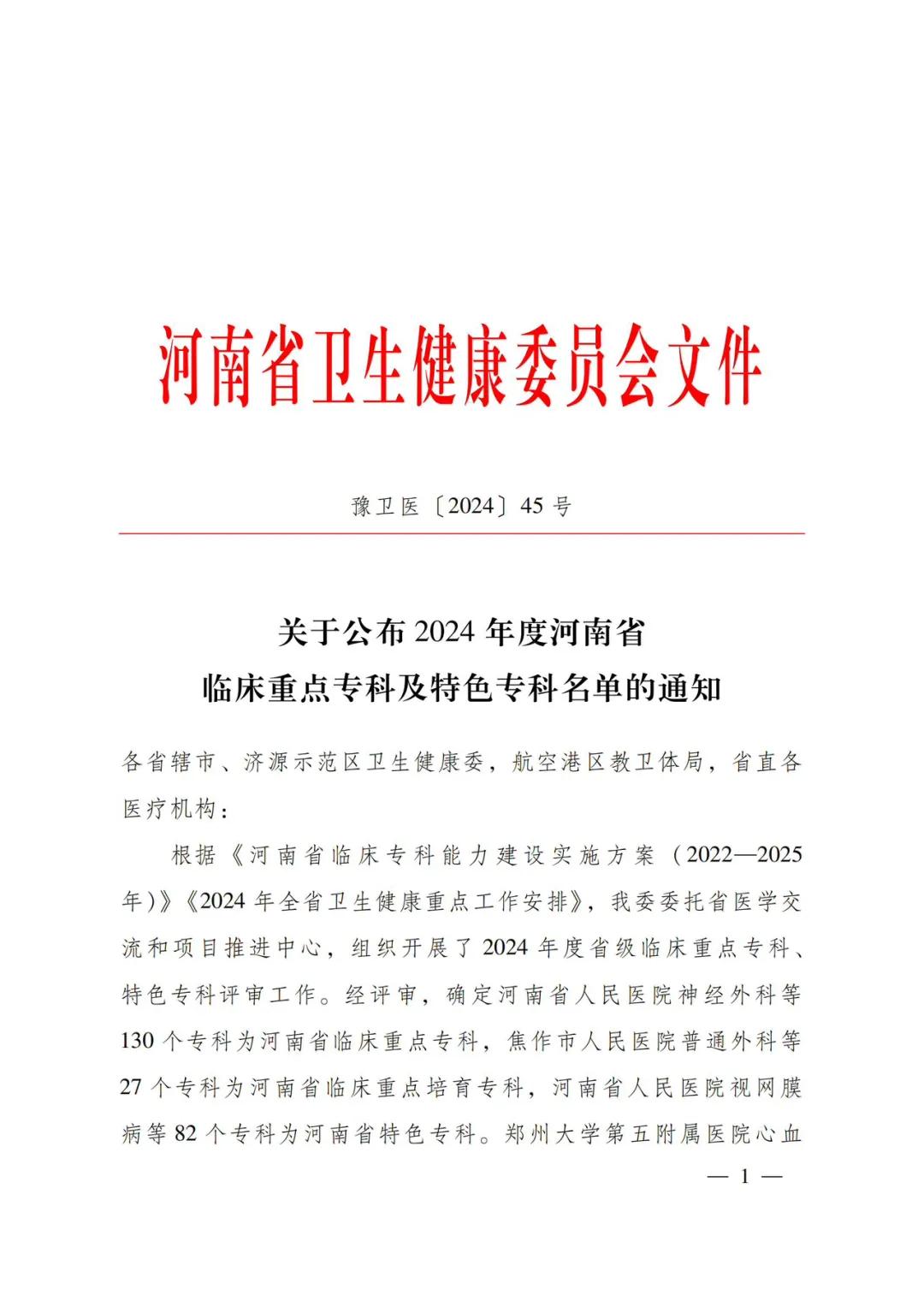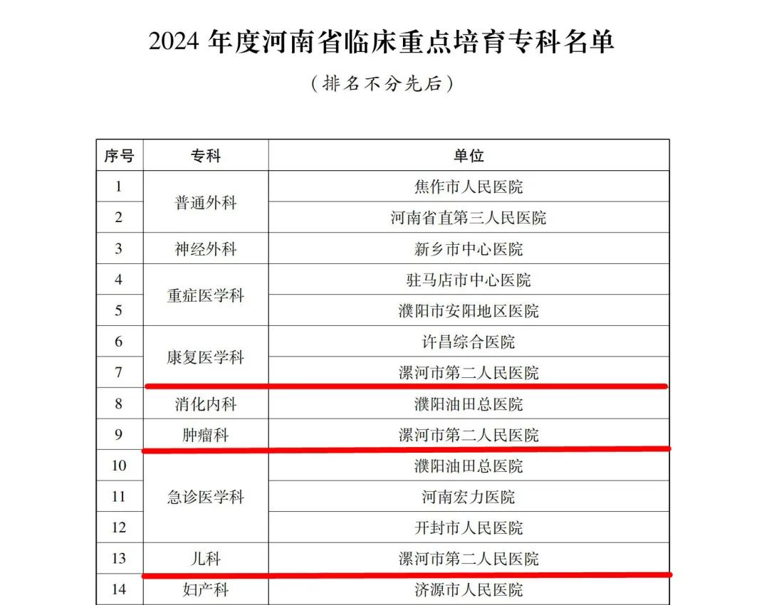 12月24日,河南省衛(wèi)生健康委下發(fā)了《關(guān)于公布2024年度河南省臨床重點??萍疤厣珜?泼麊蔚耐ㄖ罚ㄔバl(wèi)醫(yī)〔2024〕45號)。市二院兒科、腫瘤科(腫瘤放療科、腫瘤內(nèi)科)、康復(fù)醫(yī)學(xué)科成功通過評審,被確定為河南省臨床重點培育??啤?/div>