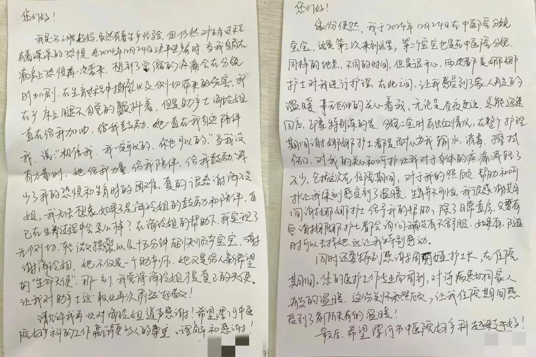 手寫的感謝信表達(dá)了對護士長周麗婭暖心細(xì)致的全程護理服務(wù),助產(chǎn)士朱海玲專業(yè)的助產(chǎn)技術(shù)及心理支持,助力寶寶平安生產(chǎn)以及謝娜娜護士耐心細(xì)致的護理和陪伴,讓她十分感動,住院期間感受到了家的溫暖和如親人般的陪伴。這些都如涓涓細(xì)流滋潤著寶媽和家屬的心田,并以寫信的方式表達(dá)對婦產(chǎn)科團隊優(yōu)質(zhì)護理服務(wù)的認(rèn)可。