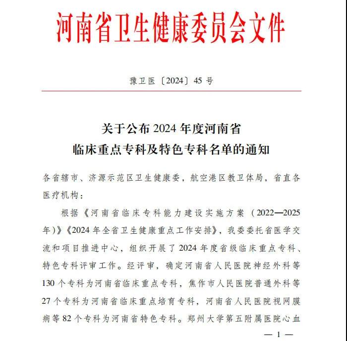 12月24日,河南省衛(wèi)生健康委下發(fā)《關(guān)于公布2024年度河南省臨床重點(diǎn)??萍疤厣珜?泼麊蔚耐ㄖ罚ㄔバl(wèi)醫(yī)〔2024〕45號)。漯河醫(yī)專高等??茖W(xué)校第二附屬醫(yī)院運(yùn)動醫(yī)學(xué)科、護(hù)理??瞥晒νㄟ^評審,被確定為河南省臨床重點(diǎn)培育???。