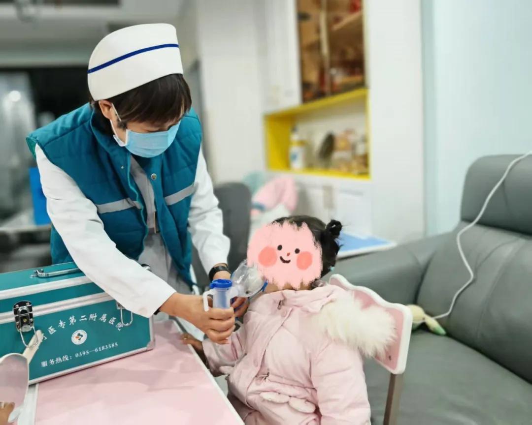然后,趙護士長一邊溫柔耐心地跟寶寶溝通來消除她的恐懼感,一邊熟練、利落地將霧化面罩放到了寶寶面前。寶寶開心地配合著,順利完成了霧化。