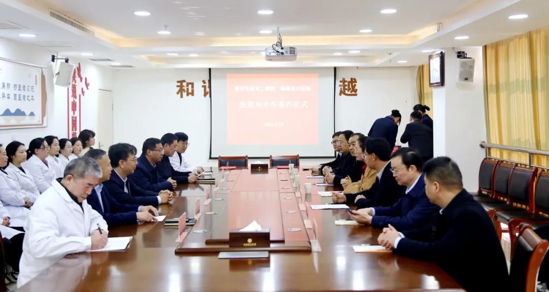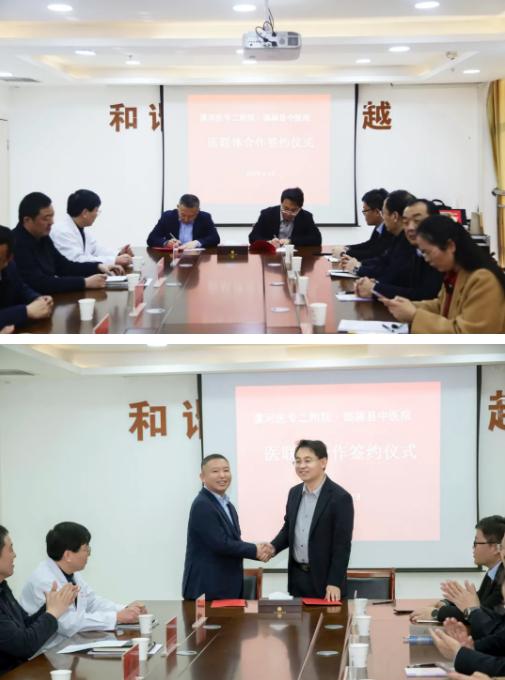 漯河醫(yī)專二附院黨委書記柴運(yùn)洪與臨潁縣中醫(yī)院黨委書記田學(xué)民分別代表雙方簽訂合作協(xié)議。