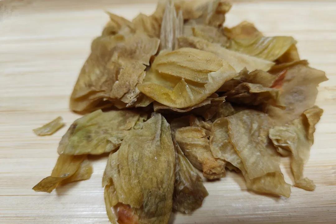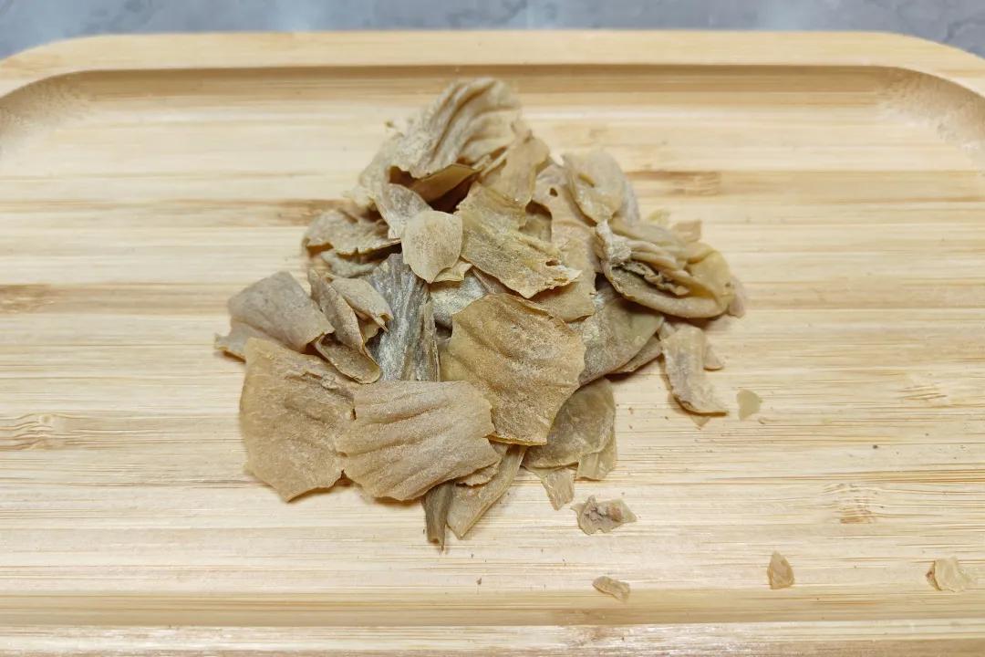 2.炒雞內(nèi)金,取大小分檔的凈雞內(nèi)金,置炒制容器內(nèi),用中火加熱,炒至鼓起卷曲、酥脆、表面黃白色時(shí),取出,放涼。