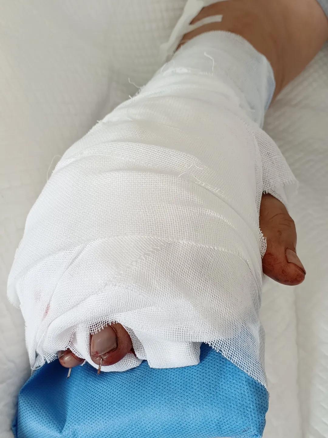 5月20日,市二院顯微外科燒傷整形科收治了3例因麥?zhǔn)毡晦r(nóng)機(jī)“咬傷”、農(nóng)具劃傷的患者。其中,56歲的劉某在收麥子時被打谷機(jī)皮帶絞傷右手,致手掌、食指、中指、環(huán)指嚴(yán)重毀損傷,骨、關(guān)節(jié)外露,因當(dāng)?shù)蒯t(yī)院無法治療,被家人緊急送往市二院顯微手足燒傷整形外科救治。“當(dāng)時整個右手血肉模糊,看上去都是爛的,我以為這個手是肯定保不住了。”患者家屬回憶當(dāng)時的場景仍然膽戰(zhàn)心驚。