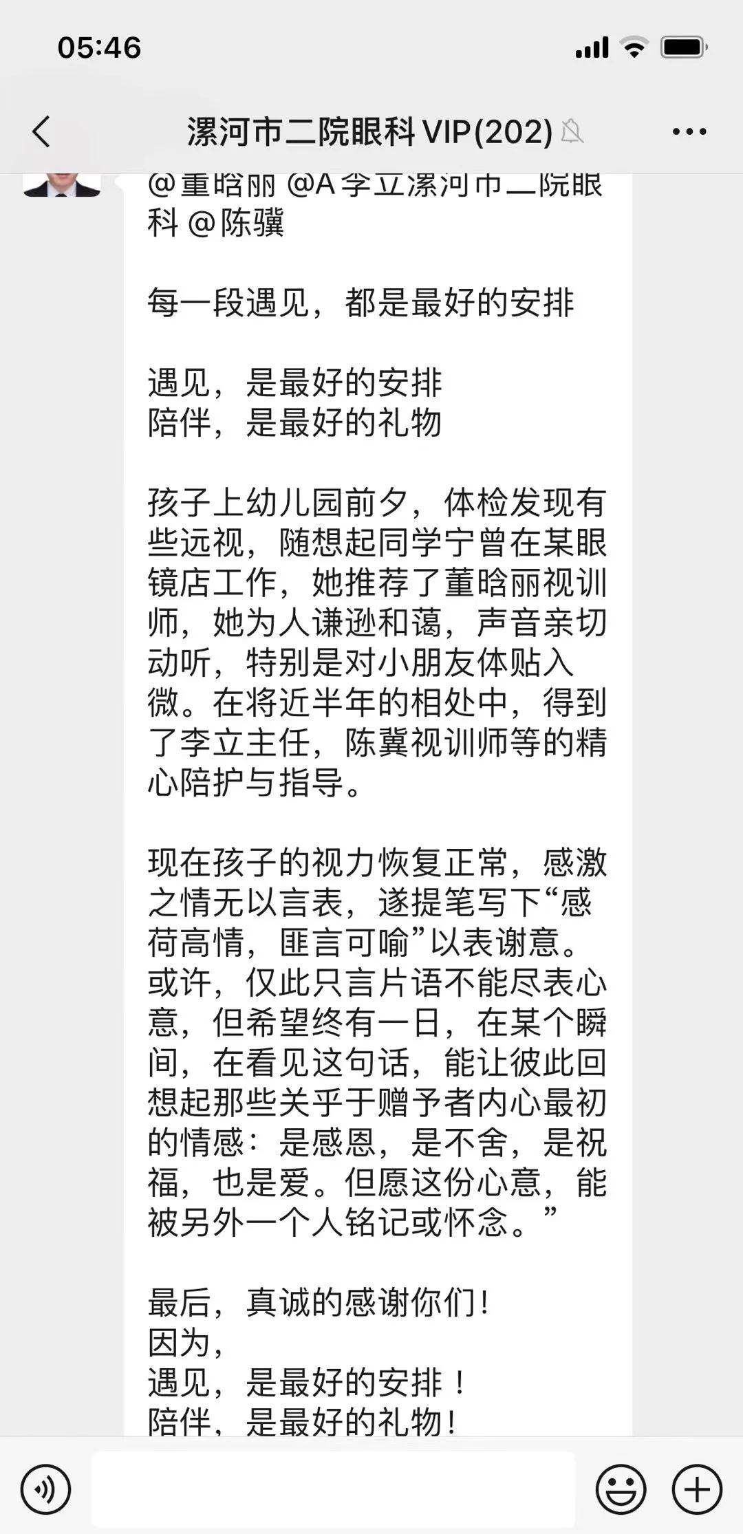 經(jīng)過半年多的康復(fù)訓(xùn)練,祺寶雙眼視力均提升到了該年齡段的正常水平0.5。祺寶的爸爸非常激動,為了表達對市二院眼科視覺康復(fù)中心全體醫(yī)護人員的感激之情,他親手創(chuàng)作了兩幅字畫,并在微信群發(fā)送了感謝信,代表了家長對醫(yī)護人員的深深敬意,更見證了市二院眼科團隊在視覺康復(fù)領(lǐng)域的專業(yè)與付出。