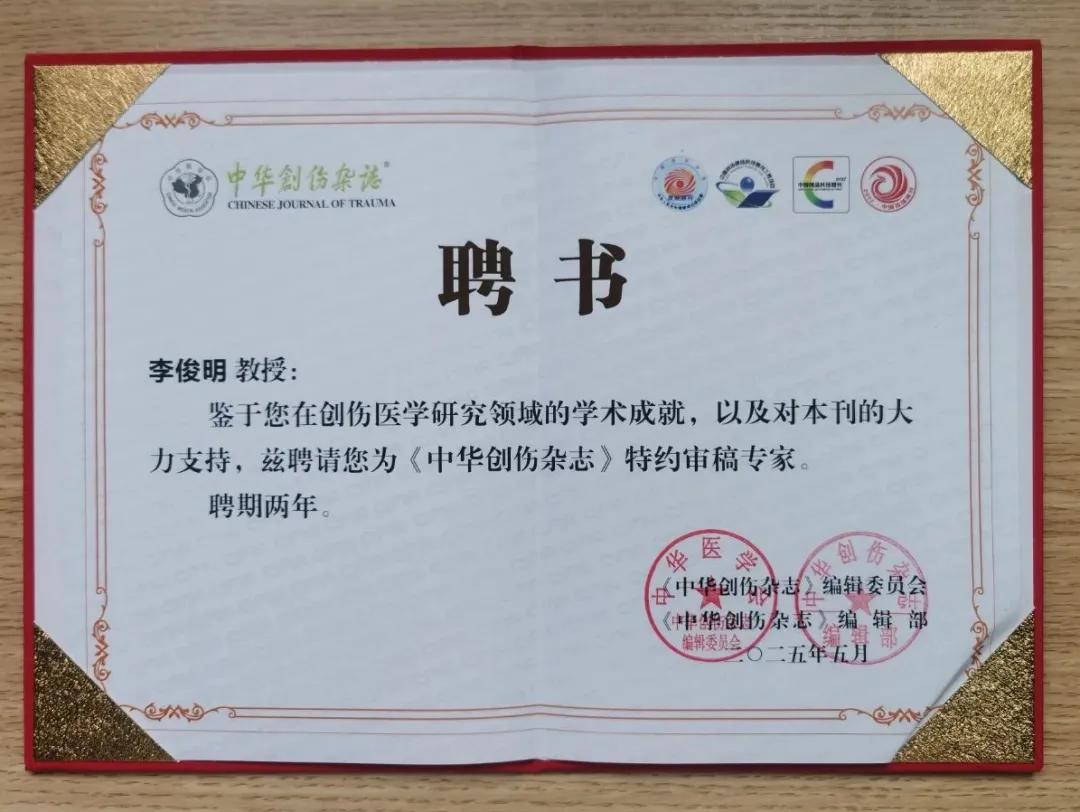 近日,漯河醫(yī)專二附院(漯河市骨科醫(yī)院、漯河市立醫(yī)院)手顯微外科(修復(fù)重建外科)主任兼大骨科副主任、骨科三級主任醫(yī)師、碩士研究生導(dǎo)師李俊明教授被《中華創(chuàng)傷雜志》特聘為特約審稿專家。此殊榮是對其在手顯微外科醫(yī)學(xué)研究領(lǐng)域?qū)W術(shù)能力的肯定,也彰顯了醫(yī)院在該領(lǐng)域的成就,為醫(yī)院發(fā)展提供了與國內(nèi)外頂尖專家交流的寶貴機會。