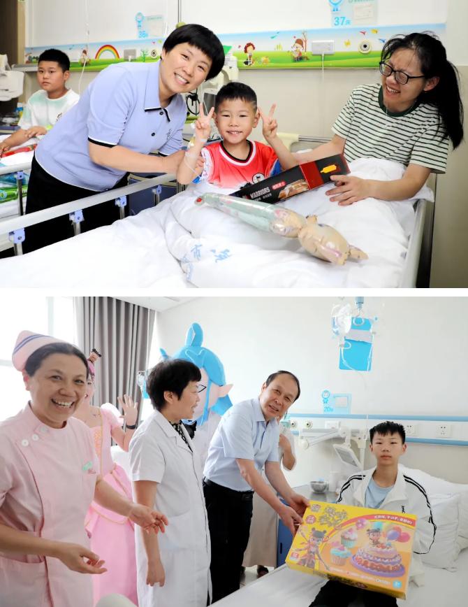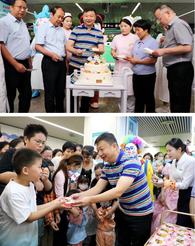 在孩子們期待的目光中,黨委書(shū)記魏松、院長(zhǎng)胡海英攜班子成員和兒科專(zhuān)家們?yōu)楹⒆觽円黄鹎邢虏⒎窒砉?jié)日蛋糕,“愿寶貝們心里有愛(ài),眼里有光,永遠(yuǎn)做自己的小太陽(yáng)!”真摯的祝福隨蛋糕甜香漫溢全場(chǎng)。