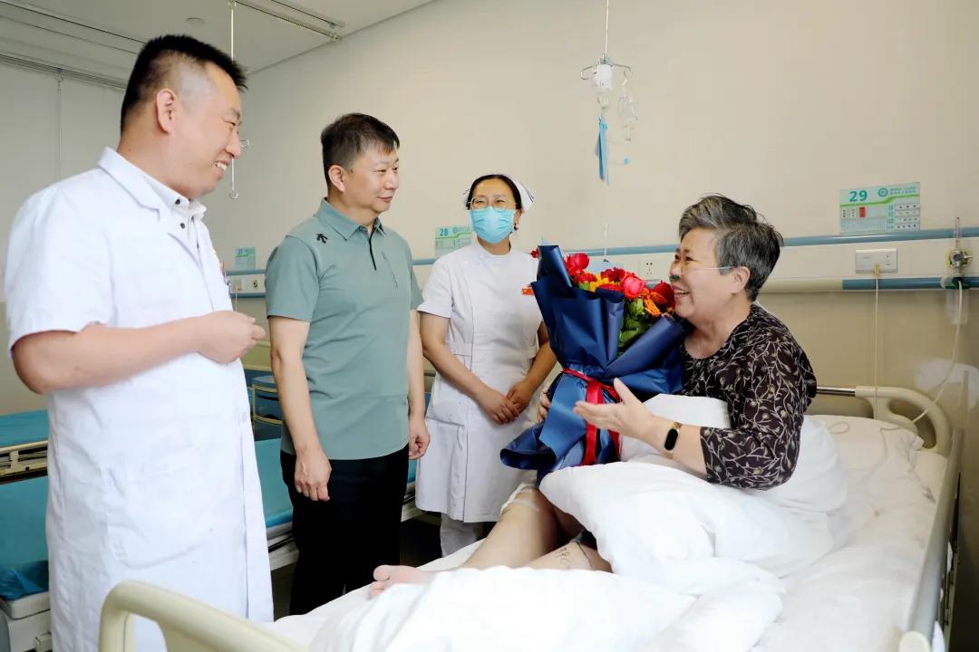 5月30日上午,市二院黨委書記魏松、副院長劉橋?qū)3虂淼讲》?,看望慰問這位康復(fù)中的香港同胞,送上代表健康祝愿的鮮花,關(guān)切詢問其身體恢復(fù)情況,并送上端午安康的祝福。“沒想到在異鄉(xiāng)生病,還能在節(jié)日收到這么溫暖的關(guān)懷,真的太感謝大家了!是二院優(yōu)秀的醫(yī)護(hù)團(tuán)隊(duì)救了我的命,我們?nèi)叶几屑げ槐M!感謝二院!感謝漯河!”翁阿姨激動(dòng)地表示,醫(yī)院高效的救治與貼心的服務(wù),讓他感受到了重生的喜悅和家一般的溫暖。