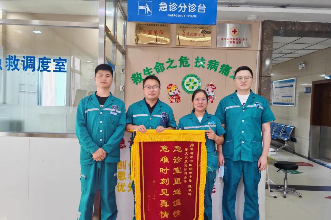 6月19日,患者家屬送來(lái)錦旗,對(duì)漯河市中醫(yī)院急診科值班醫(yī)護(hù)人員表示感謝!