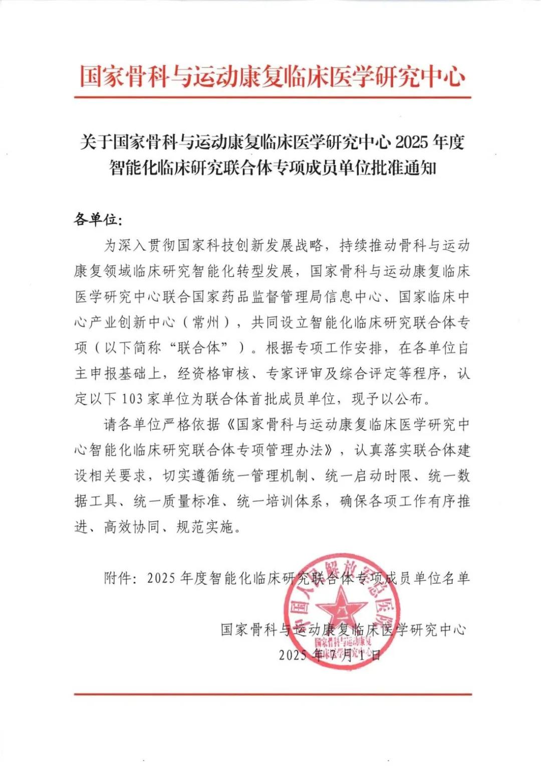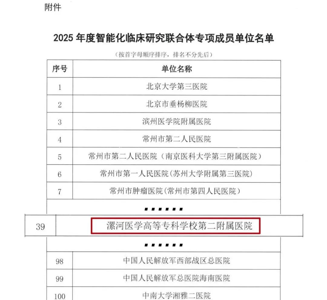 由國家骨科與運動康復臨床醫(yī)學研究中心(以下簡稱“國家臨床中心”)聯(lián)合國家藥品監(jiān)督管理局信息中心、國家臨床中心產業(yè)創(chuàng)新中心(常州)共同設立的“2025年度智能化臨床研究聯(lián)合體專項”已完成首批成員單位遴選,共103家單位成功入選(具體名單見文末附件),覆蓋全國26個省份。 其中漯河醫(yī)專二附院成功入選國家臨床中心“智能化臨床研究聯(lián)合體專項”首批成員單位
