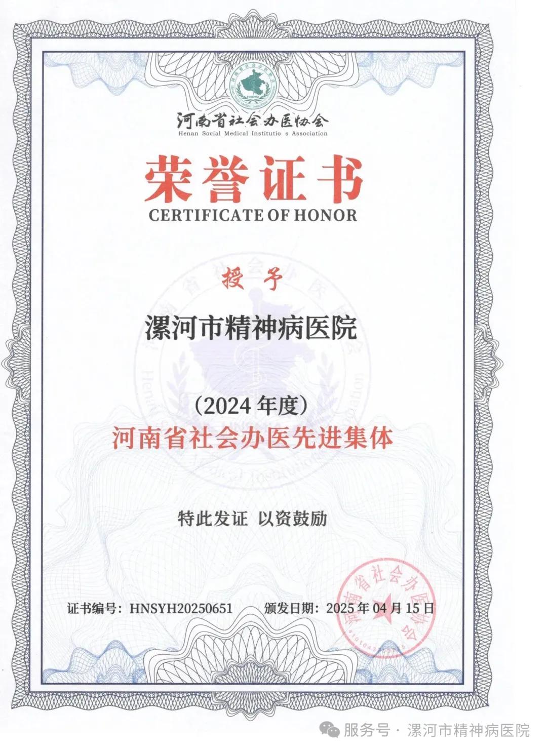 漯河市精神病醫(yī)院榮獲“河南省社會辦醫(yī)先進(jìn)集體”榮譽(yù)稱號
